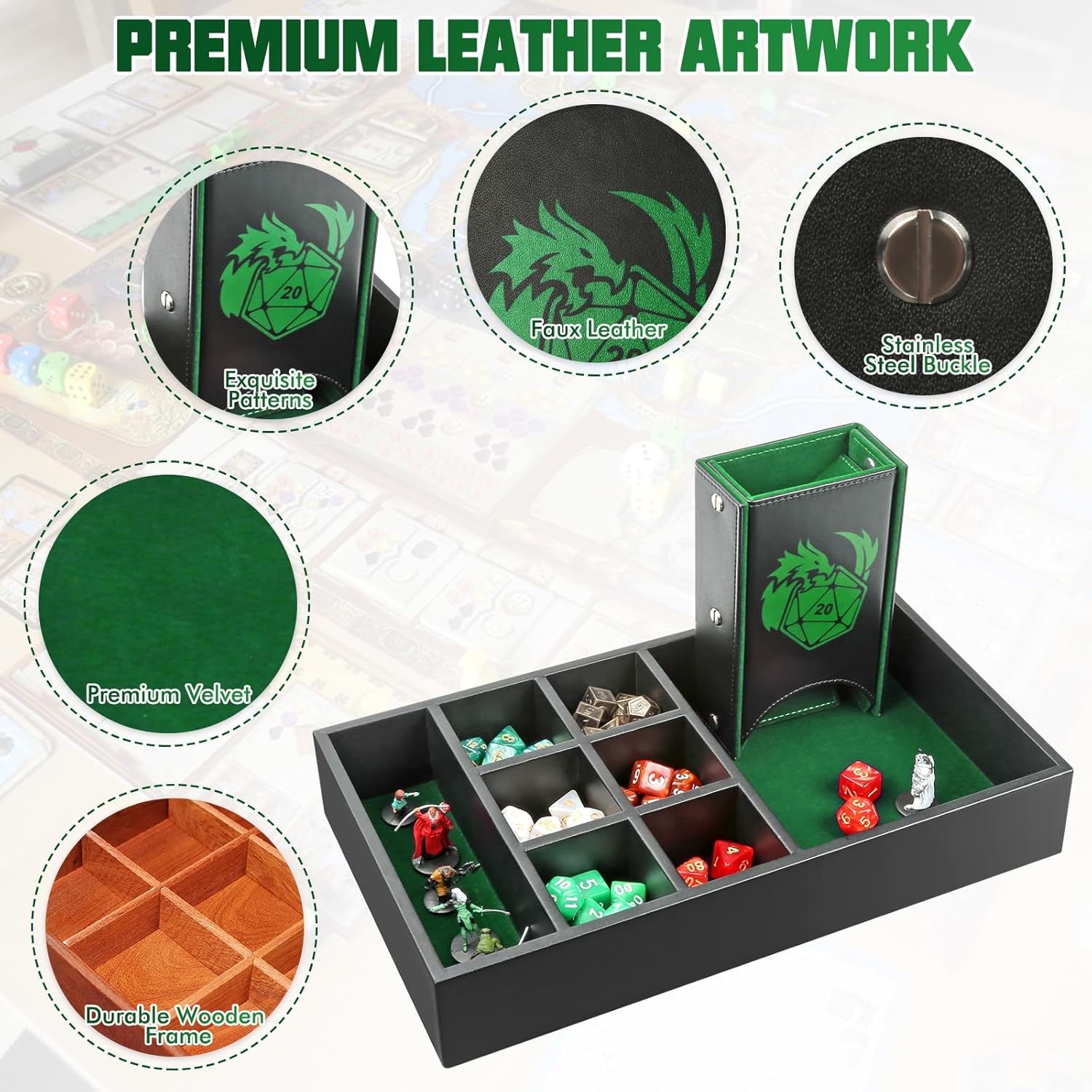 - ★【Premium Leather Artwork】-- DND dice box has a sturdy frame inside, ensuring that it will not deform after long-term use. The exterior is wrapped in high-quality faux leather, which is very durable. The interior is made of exquisite velvet fabric, which can reduce the sound of dice rolling and effectively protect your dice. 100% handmade and unique. This is not only a dice case, but also an artwork. When you own it, you will be surprised by its exquisite appearance!