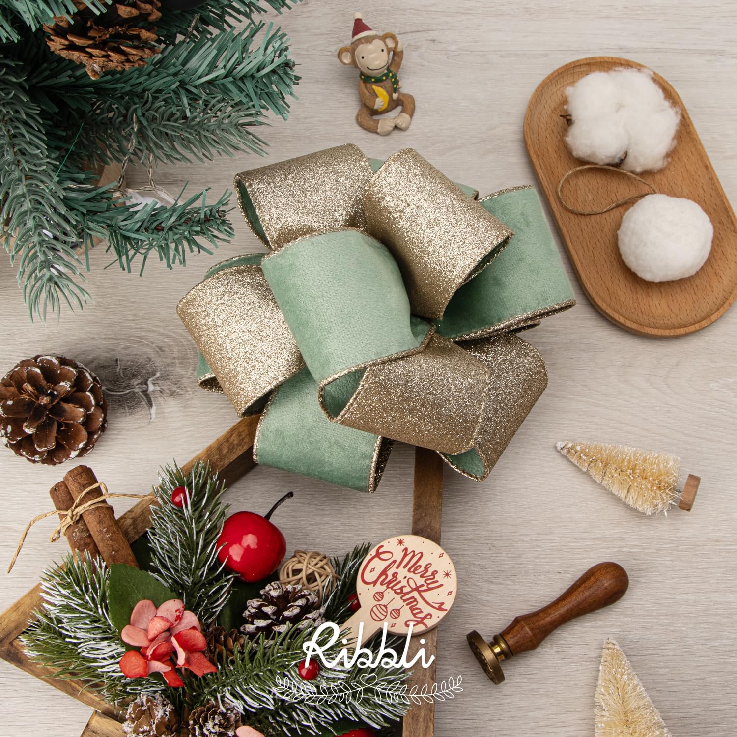 Ribbli Sage Velvet Wired Ribbon 2.5 Inch Sage Velvet with Champagne Glitter Christmas Ribbon for Christmas Tree Decoration Big Bow Gift Wrapping Crafts Wreaths Supplies- 10 Yards