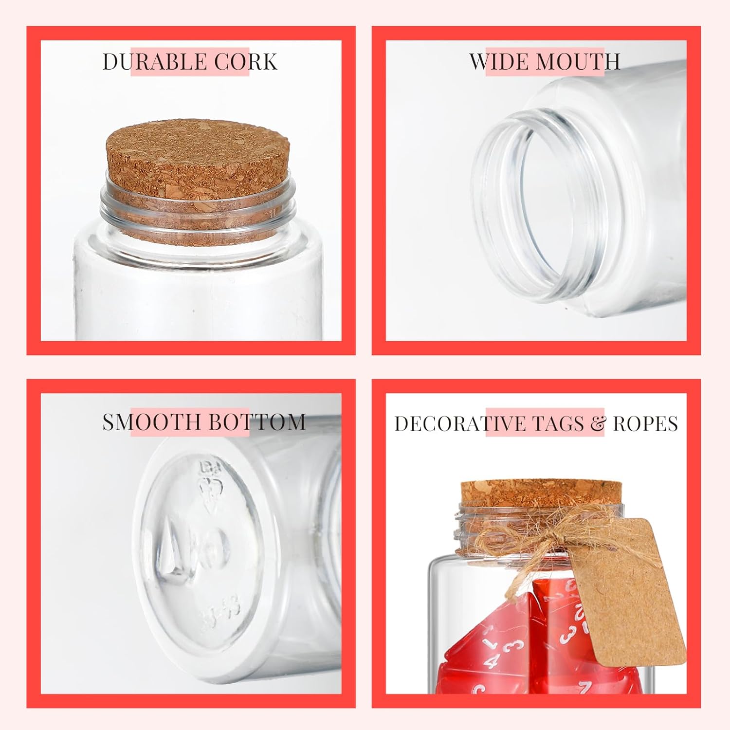 - Convenient Sizes: 4 sided dices measure approx. 0.87 inches/ 2.2 cm in height, and about 0.71 inches/ 1.8 cm in diameter; Additionally, designed with a height of about 2.13 inches/ 5.4 cm and a diameter of about 1.77 inches/ 4.5 cm, these plastic Jars offer a compact size that fits well in your hand, making them easy to handle and store