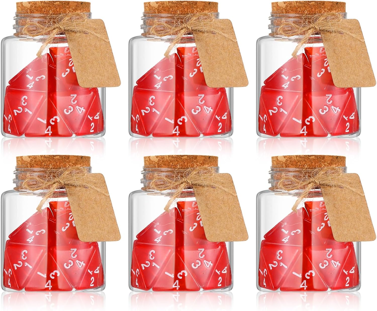 - What You Will Get: this package includes 120 pieces of red D4 dice, 6 pieces of potion bottle with cork lids, 6 pieces of label tags, and 1 roll of burlap ribbon (measuring about 32.81 ft/ 10 m); These additional accessories enhance the visual appeal and versatility of the bottles