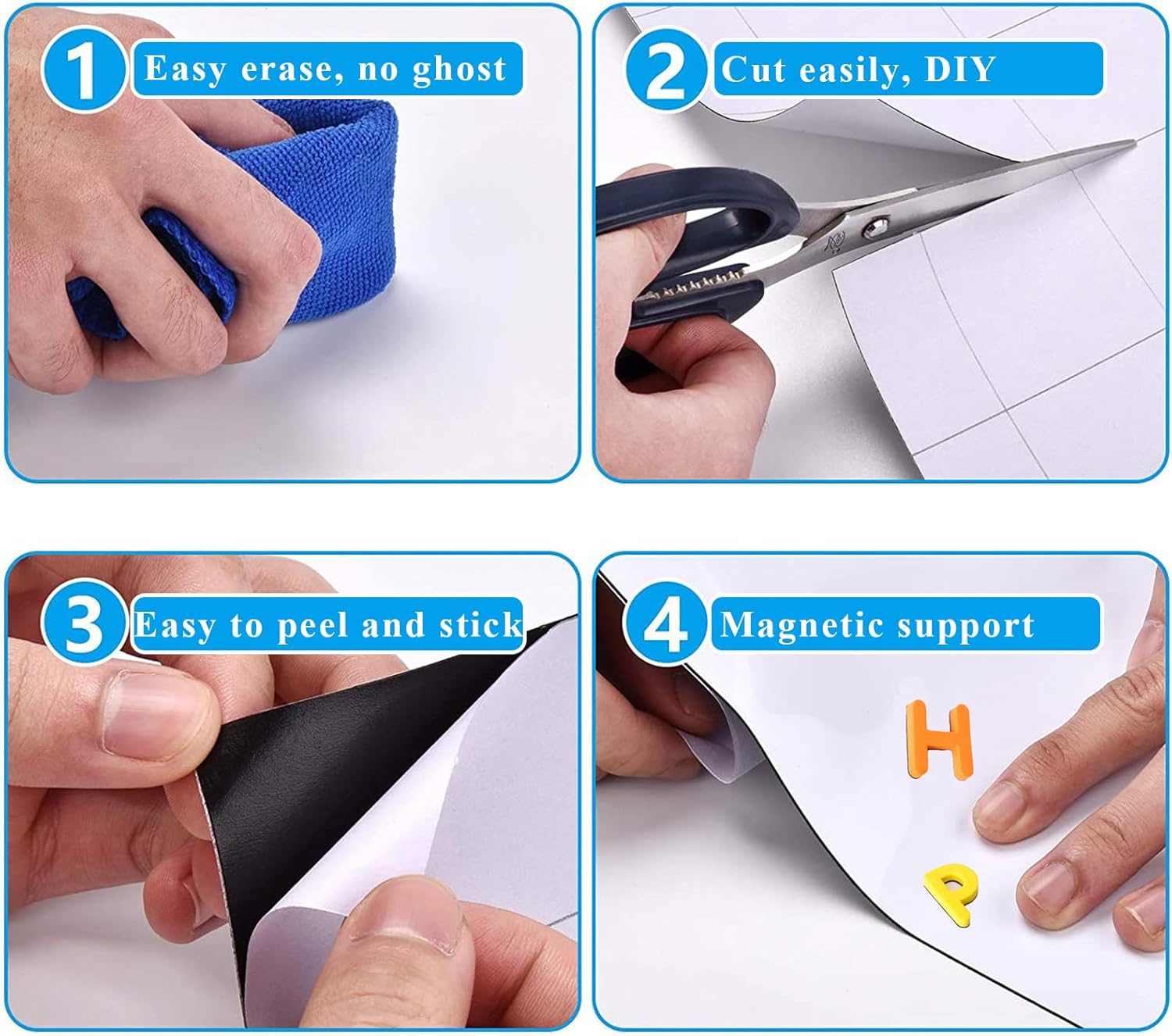 - 【CUSTOMIZABLE DESIGN】: Whiteboard adhesive sheets with protective word sticker on the back, can be cut to any size. The whiteboard adhesive sheets is lightweight and soft, making full use of the supply and demand of adhesive white board for wall, which can be cut at will in a relatively flexible and affordable way, cutting unique whiteboard sizes according to different spaces, greatly saving space. It is a good helper for your life and work.
