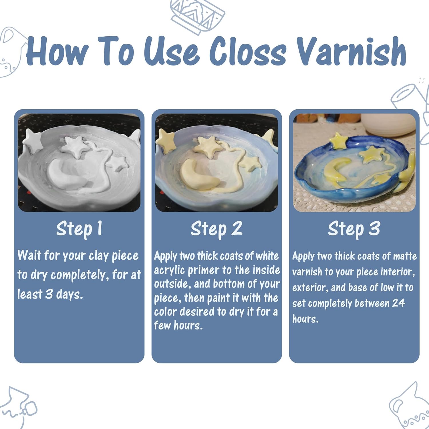 - How To Use: 1, Wait for your clay piece to dry completely, for at least 3 days; 2, Apply two thick coats of white acrylic primer to the inside, outside, and bottom of your piece, then paint it with the color desired to dry it for a few hours; 3, Apply two thick coats of gloss varnish to your piece interior, exterior, Allow to dry for at least 24 hours