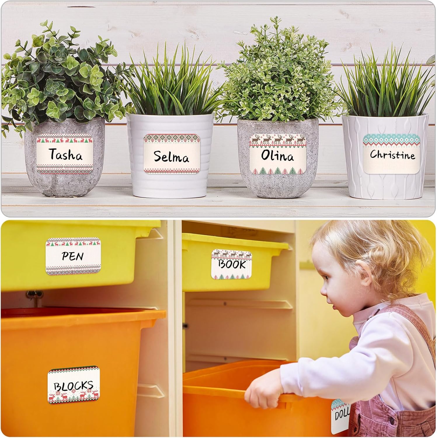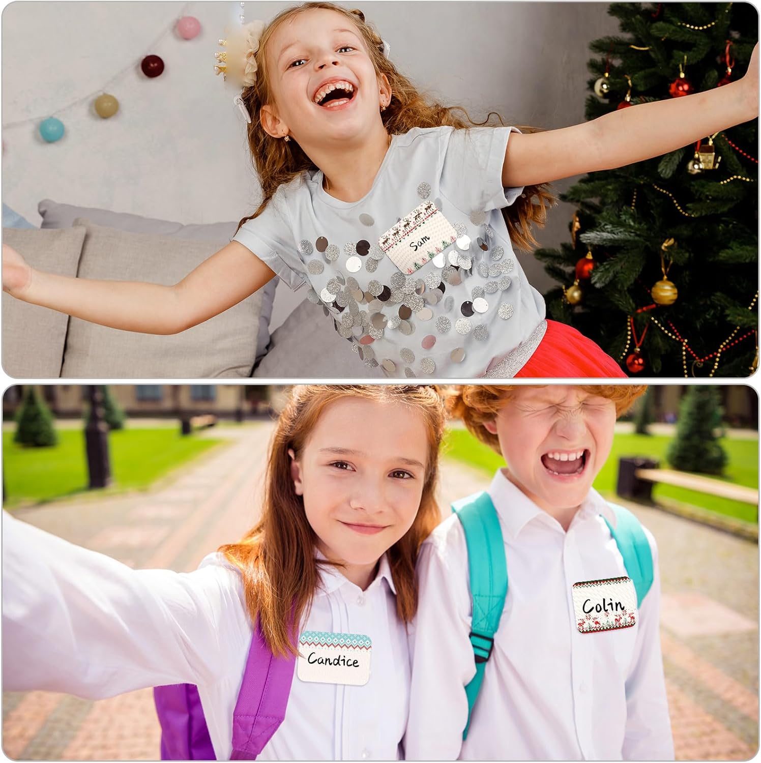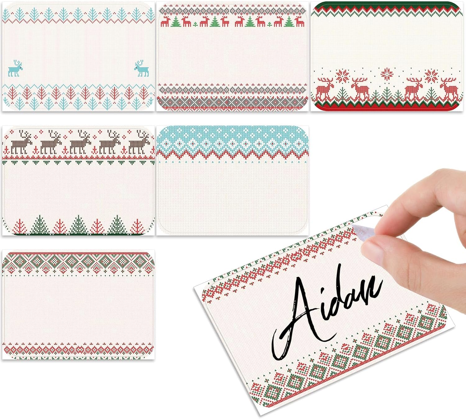 - Festive Design: these Christmas name tag stickers for kids feature beautiful borders of seasonal elements in Christmas colors, including ugly sweater, Xmas tree, and reindeer, which can add a warm touch to your holiday decoration needs