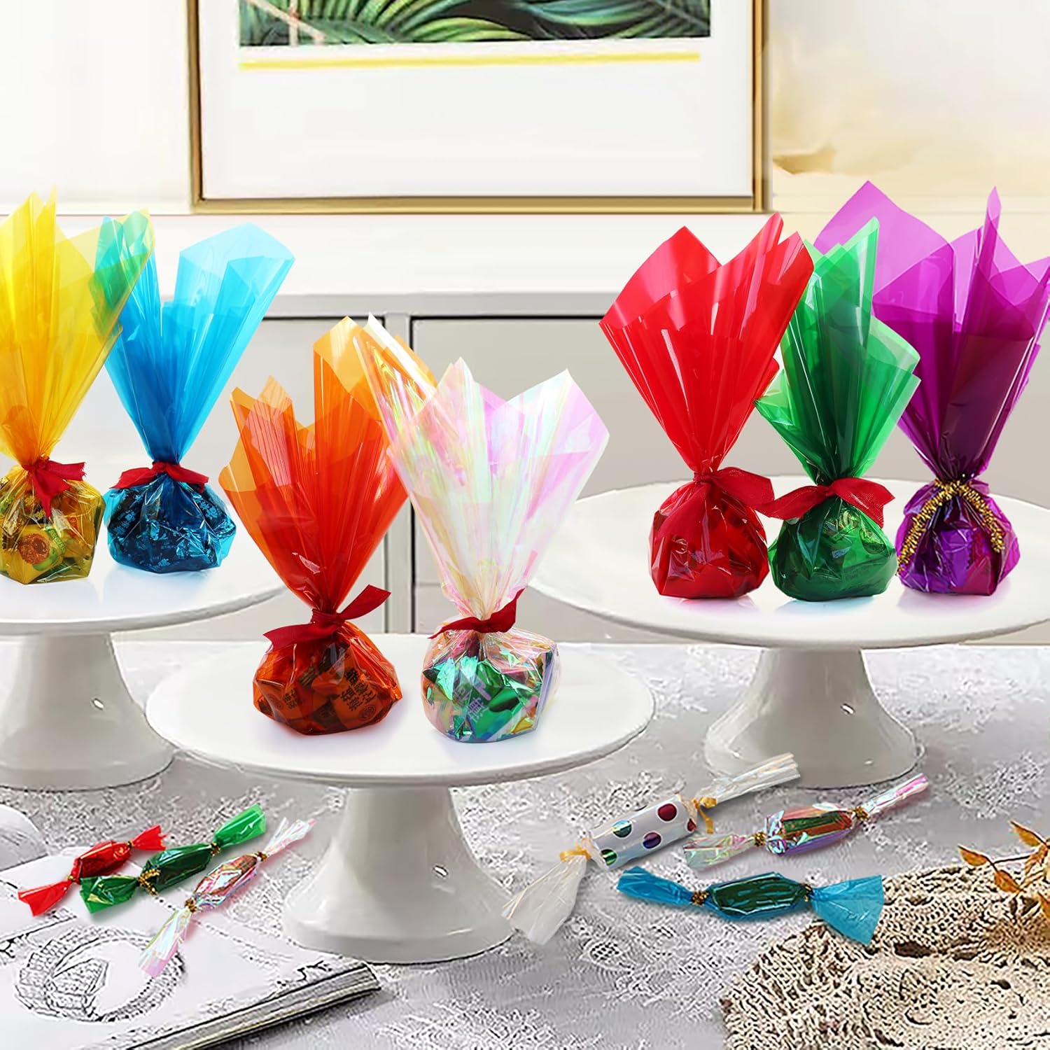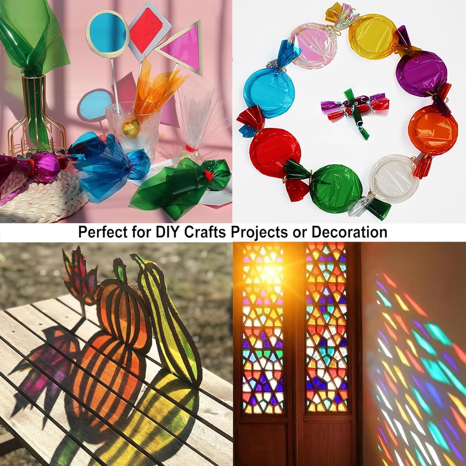 - Transparent Colored Cellophane Wrap - Allow seeing through the things of the package. Up to 8 colors for your choice, these colorful cellophane wrap large are great for light shadow game, window light, shadow creativity, candy lei or as cellophane gift wrap to make your well-prepared gifts & crafts more glamorous and eye-catching.