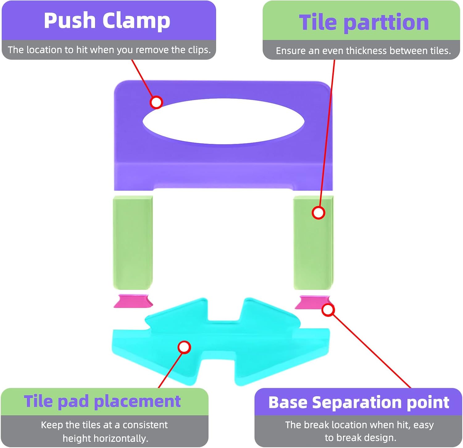 - 【Material & Demand】Our tile spacers are made of Polypropylene Plastic (PP). Generally, four clips are recommended per tile. This is to ensure all four corners are flush with the neighboring tile. If you have larger tiles, 6 or 8 clips per tile are recommended.