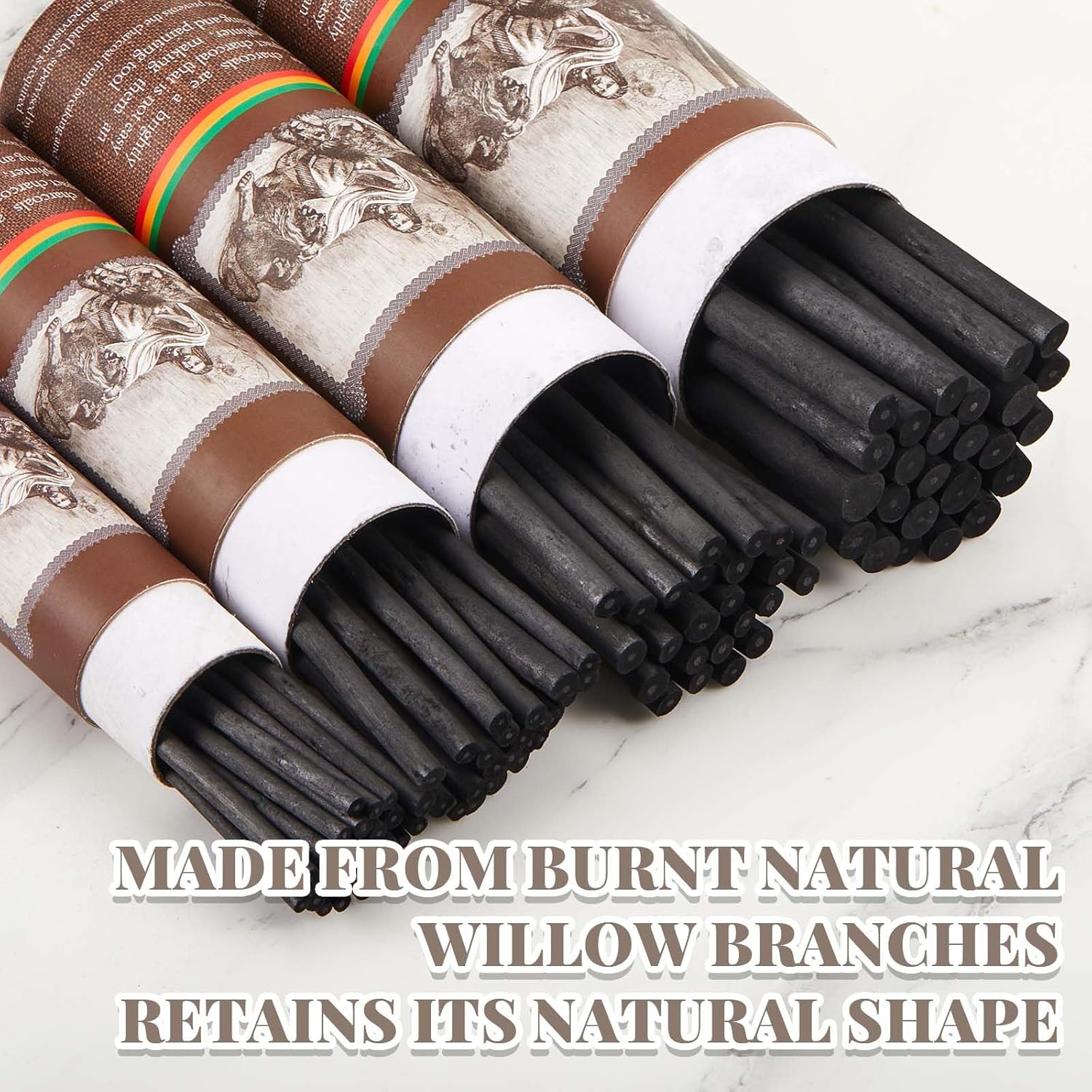 - Sturdy and Reliable Willow Charcoal: we have improved the box and still provide the smooth and quality willow charcoal sticks; The sketch tools are made of willow charcoal, you can experience the blend of endurance and convenience, ensuring lasting usage, it slides smoothly and has smooth lines when applied; Willow is darker and more forgiving than vine, which can produce a range of tones, and willow breaks less than vine charcoal