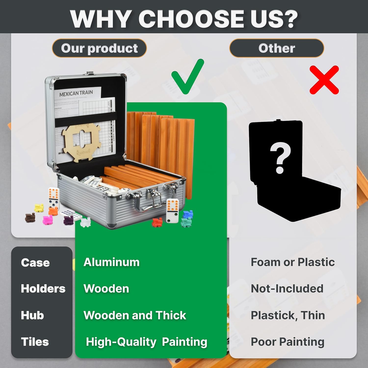 - Complete Mexican Train Dominoes Set: 4 Wooden Domino Holders, Hub, 91 Tiles, 9 Plastic Trains, Score Pad, Instruction, and Aluminum Carrying Case