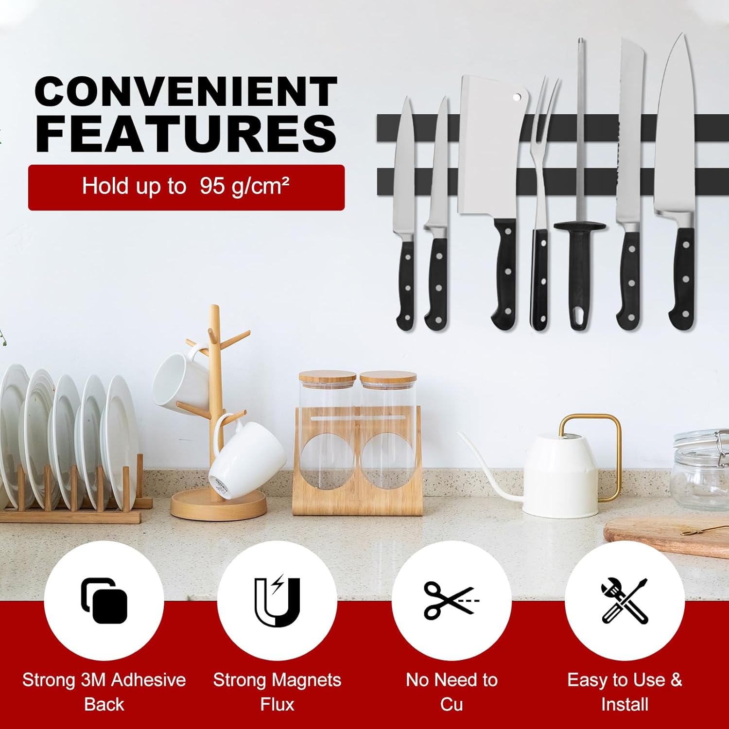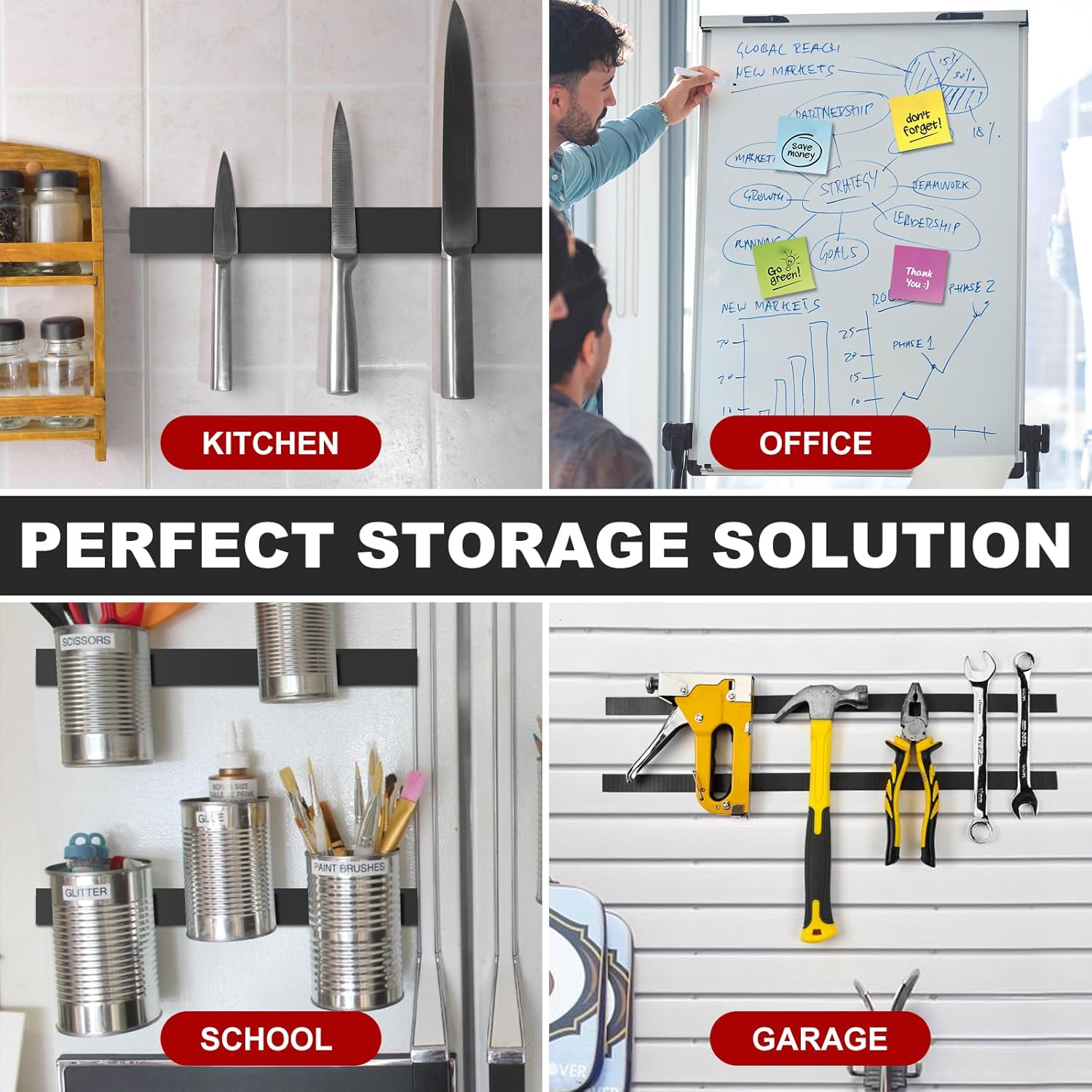 - ✔【WIDE APPLICATION】The strong adhesive magnetic tape strips with adhesive backing connects the objects easily with magnetic boards (e.g. whiteboards, blackboards ) and fridges, can be used as magnetic tool holder strip for wall, flexible knife magnetic strip, magnetic key holder, magnetic garage tool, magnetic screw holder and tool stand for garage storage and kitchen magnetic fridge organizer.