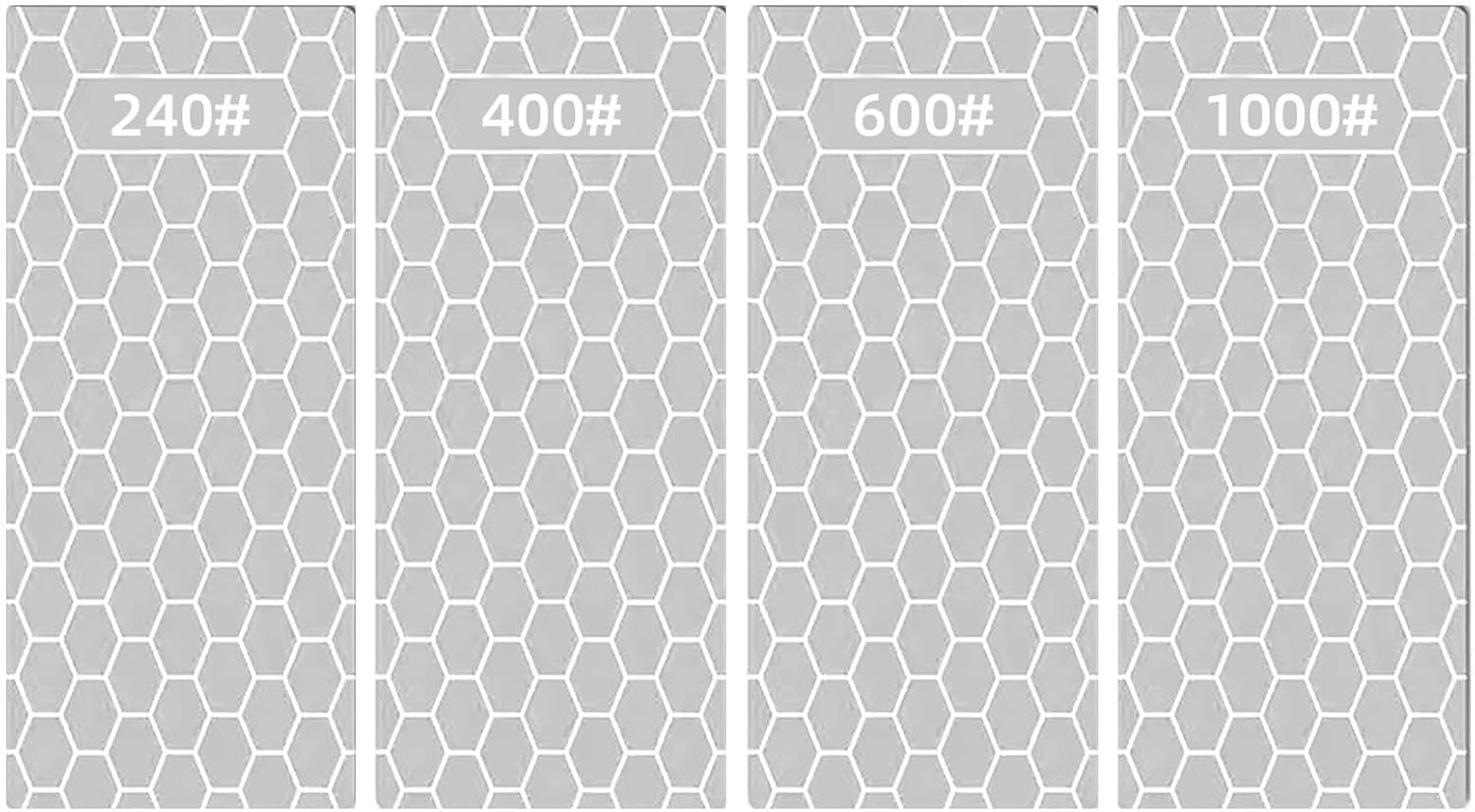 - 4 DIAMOND SHARPENING PLATE: 4 pieces grinding stones with anti slip base,made of durable diamond material. They respectively are #240 #400 #6000 #1000