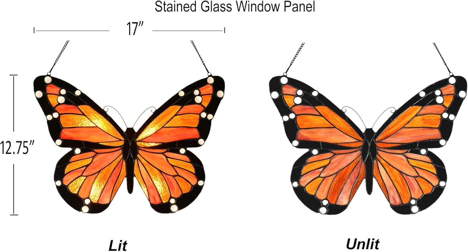 - DESIGN- This is a monarch butterfly designed stained glass panel, orange wings, black edges and white spots,looks vivid and lifelike! It sizes in W 17"x H 12.75",comes with a 26" long black metal chain. Everyone is like a butterfly, they start out ugly and awkward and then morph into beautiful graceful butterflies that everyone loves.