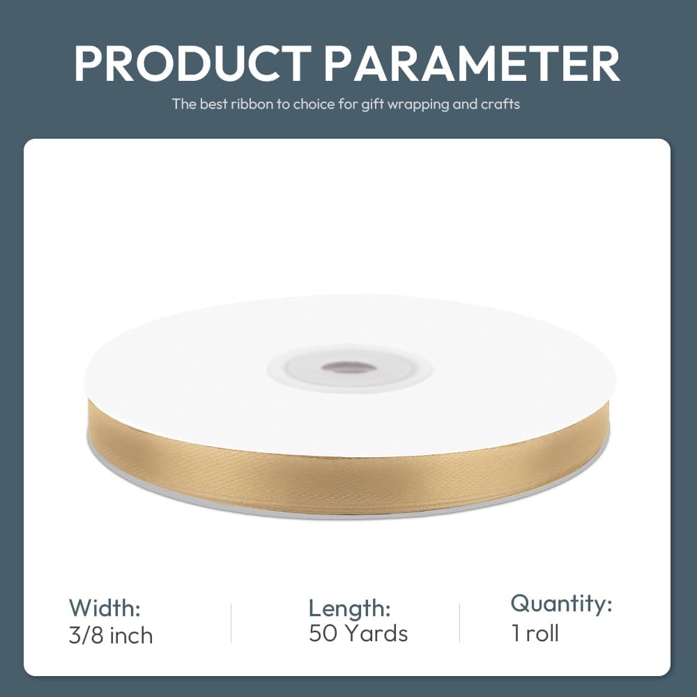 3/8" Wide x 50 Yards Champagne Gold Single Faced Polyester Satin Ribbon for Wedding Decor, Wreath, Crafts, Gift Wrapping & Other Projects