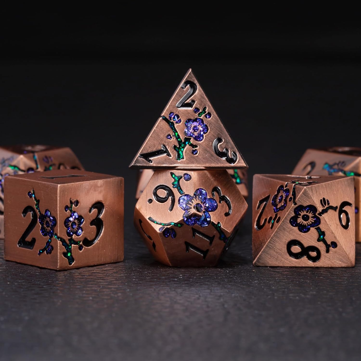 Metal DND Dice Set, Dungeons and Dragons Metallic Flower Dice with Gift Case, Polyhedral Dice Sets for Tabletop Games (Antique Red Copper - Purple)