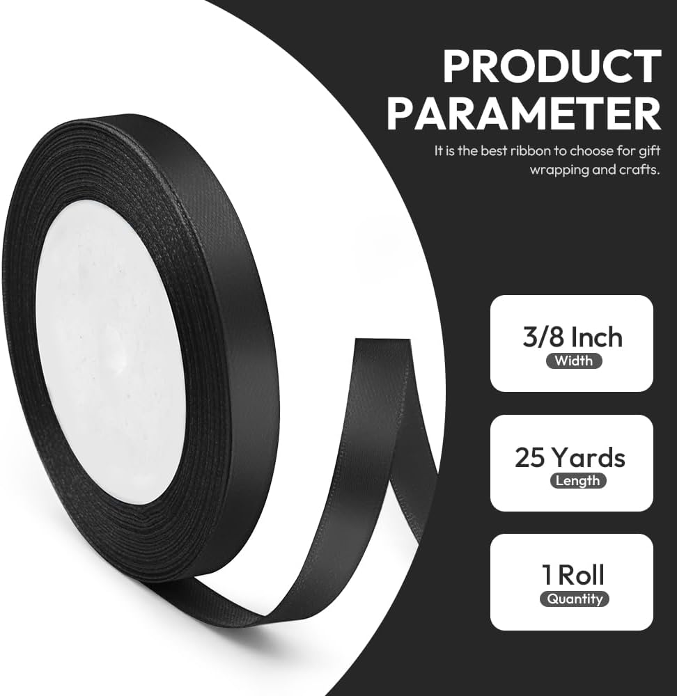 3/8" x 25 Yards Satin Ribbon, Black Silk Ribbon Ideal for Gift Wrapping, Floral Bouquets, Crafts, Wedding Party Decorations, Christmas and Sewing Projects