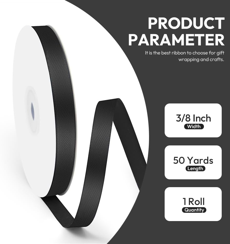 - 【Size】High grade single face black ribbon has a 3/8 inch width and comes in a lengthy 50 yards roll, providing ample material for all your creative projects. The built-in spool adds convenience, making it easy to handle and store.
