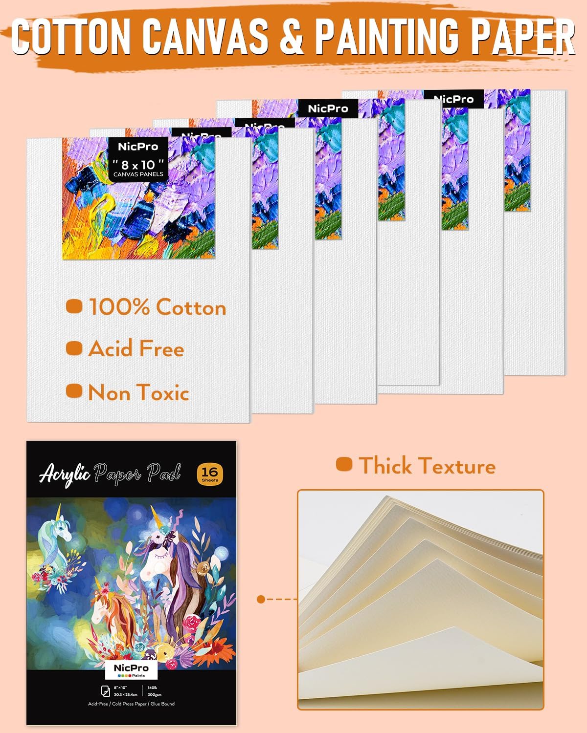 - Canva Panels & Painting Pad: There are 8pcs 8"x10β canvas panels in the paint kits for adults, 100% cotton canvas surface, meeting your needs of creative painting. 16 Sheet of 8"x10" acrylic painting paper with high quality material and thick texture