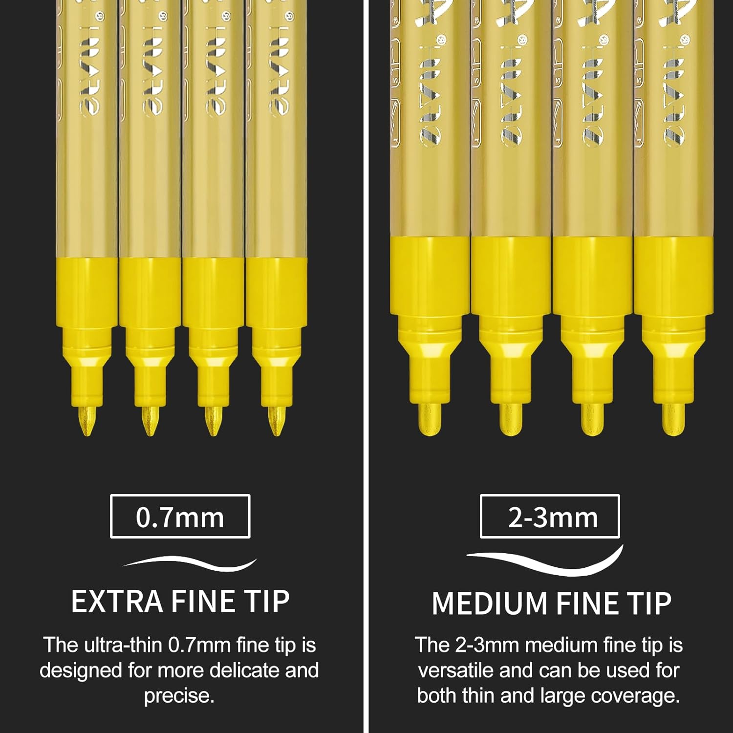- Vibrant Metallic Gold Finish & Dual-Tip Versatility: Includes 4 Medium Tips (2-3mm) for bold strokes and 4 Extra Fine Tips (0.7mm) for intricate detailing. Perfect for adding luxe accents to crafts, signage, or artwork.