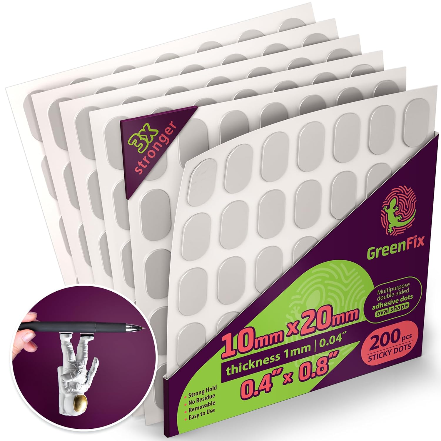 - π¦ PREMIUM QUALITY GreenFix clear gel dots made of non-toxic materials following highest quality standards. Double sided sticky dots set consists of 200pcs thin oval shaped sticky tack, 0.4β x 0.8β each.