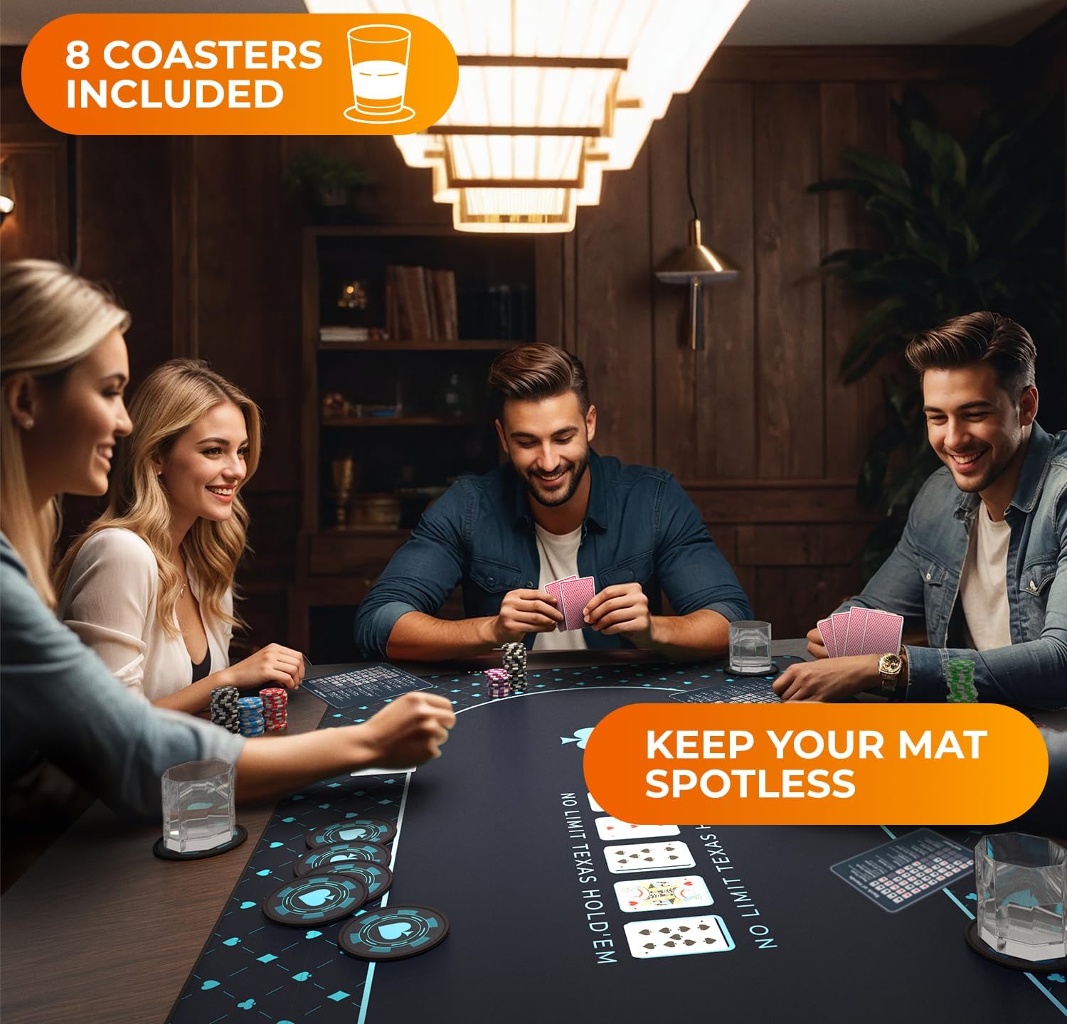 - Coasters & quick-reference cards - Say goodbye to drink stains with our 8 coasters, designed to protect your poker mat for table from dirty circles caused by glasses. Use the included 8 insert cards to display poker hands, offering quick reference for a phone-free, focused game.