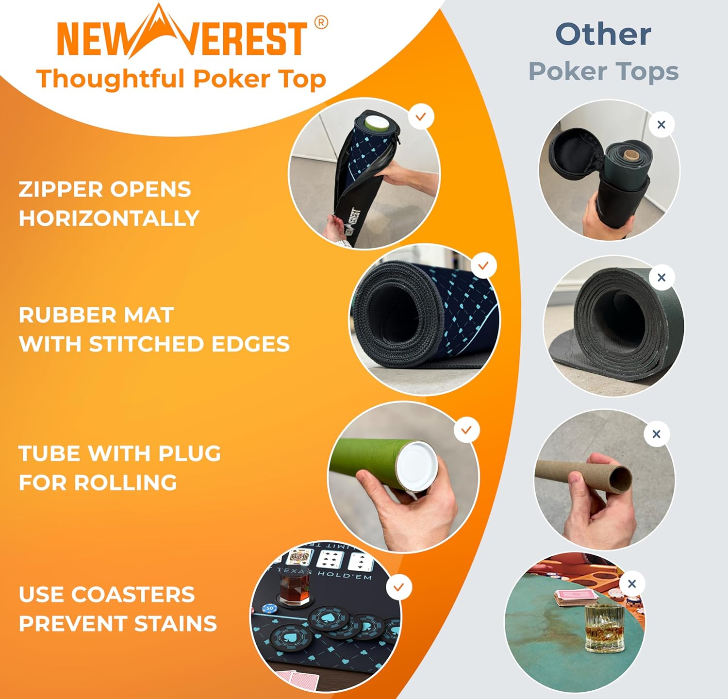 - Portable easy-pack zipper bag - Our bag's horizontal zipper design simplifies storing your poker table mat. Just roll, place, and zip, avoiding the hassle of drawstring bags where you have to awkwardly stuff the mat in from the top. The Newverest travel-friendly bag is all about simple, secure storage.
