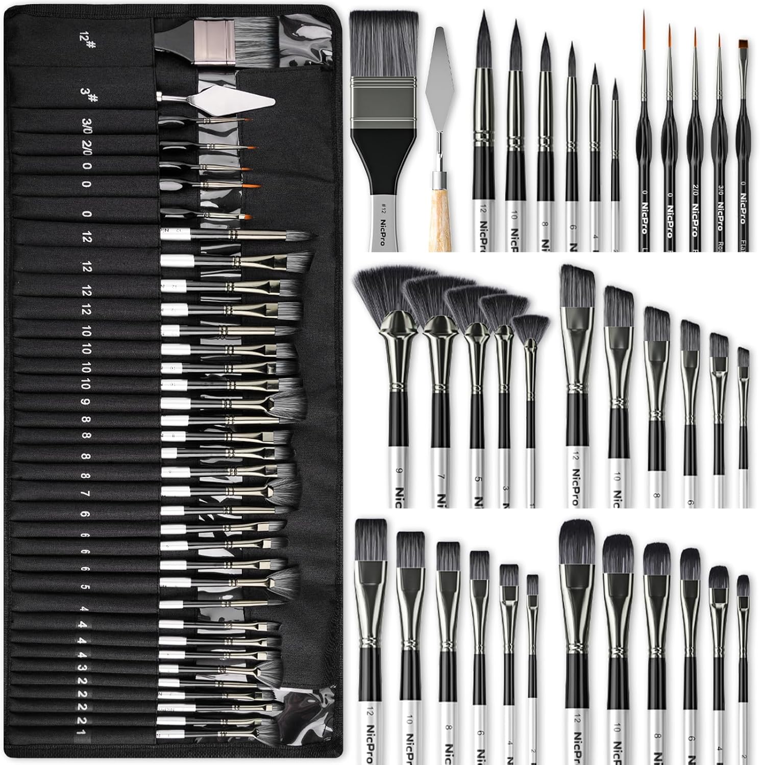 Nicpro 36pcs Paint Brush Set, Professional Paintbrushes with Palette Knife and Cloth Roll, Suitable for Artists and Beginners for Acrylic Painting, Oil, Watercolor, Gouache