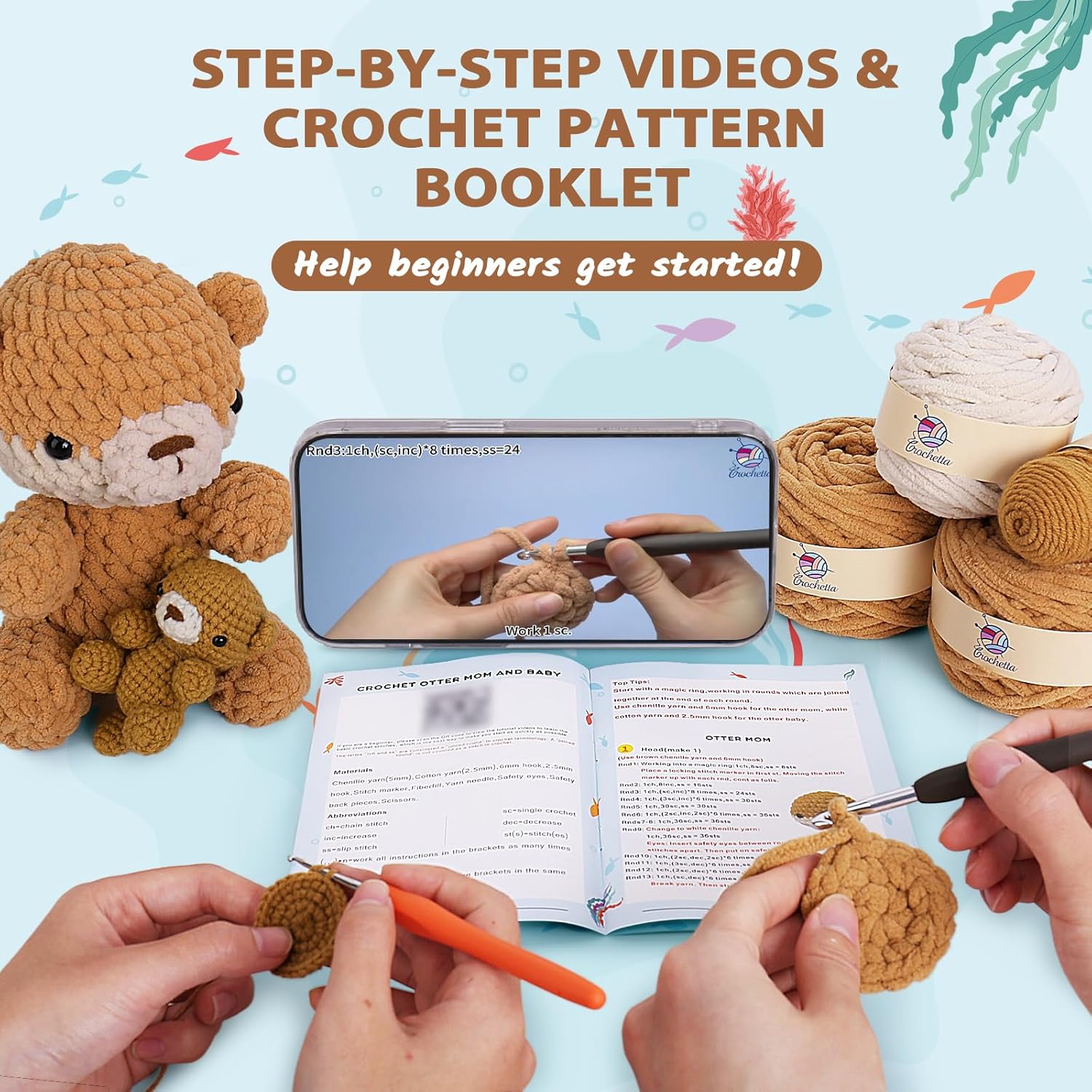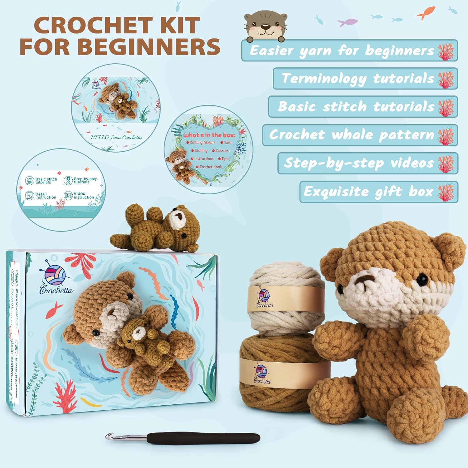 Crochetta Crochet Kit for Beginners, Crochet Starter Kit w Step-by-Step Video Tutorials, Beginner Crochet Kit for Adults Kids Women Men Complete Kit Included (Otter Mom and Baby)