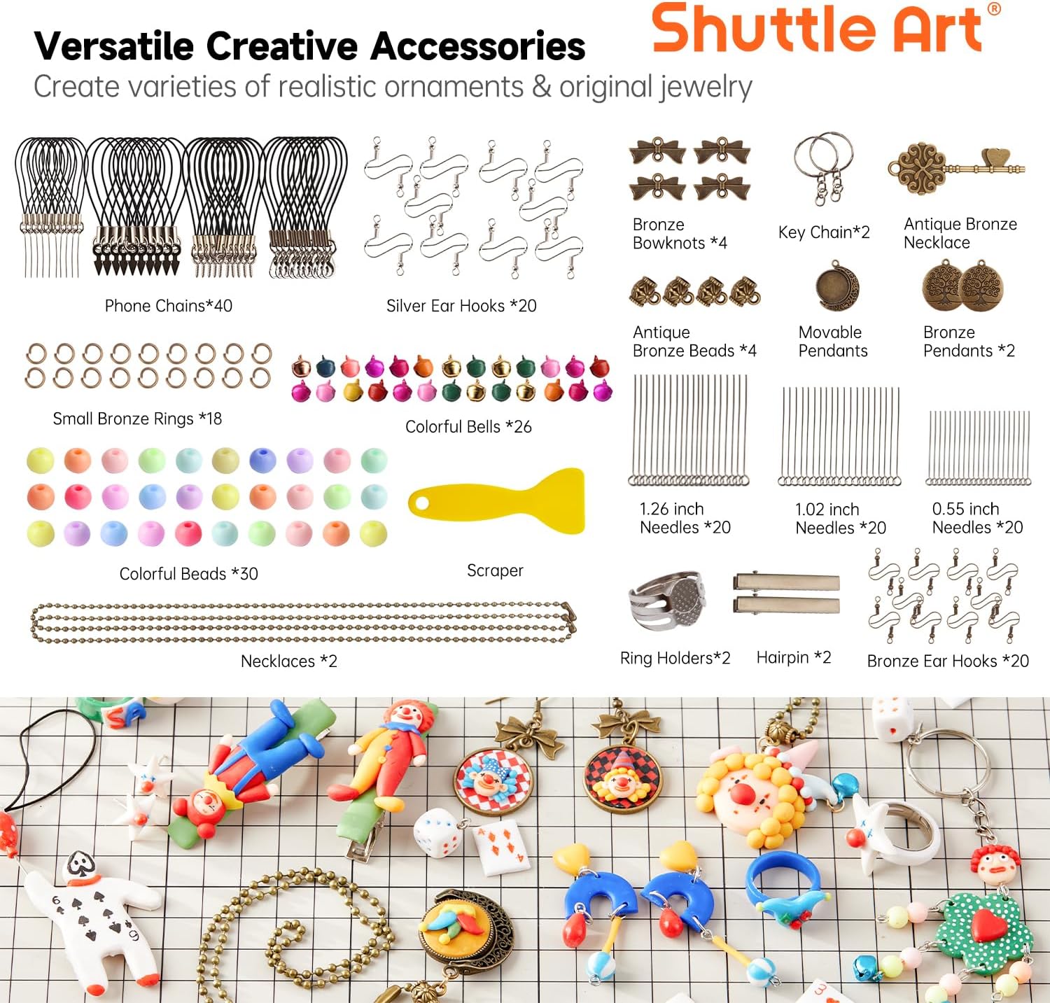 - COMPLETE CLAY TOOLS & CREATIVE ACCESSORIES: Comes with complete clay tools, scraper, bells, beads, earring hooks, hairpin holder, ring holders, key ring, gem silicone mold, needles, mobile phone chains, user manual, and more. Unleash your creativity with 20 polymer clay tools and 16 kinds of accessories to create clay earrings or a necklace with polymer clay beads, an ornament, a jewelry holder, a keychain, and more