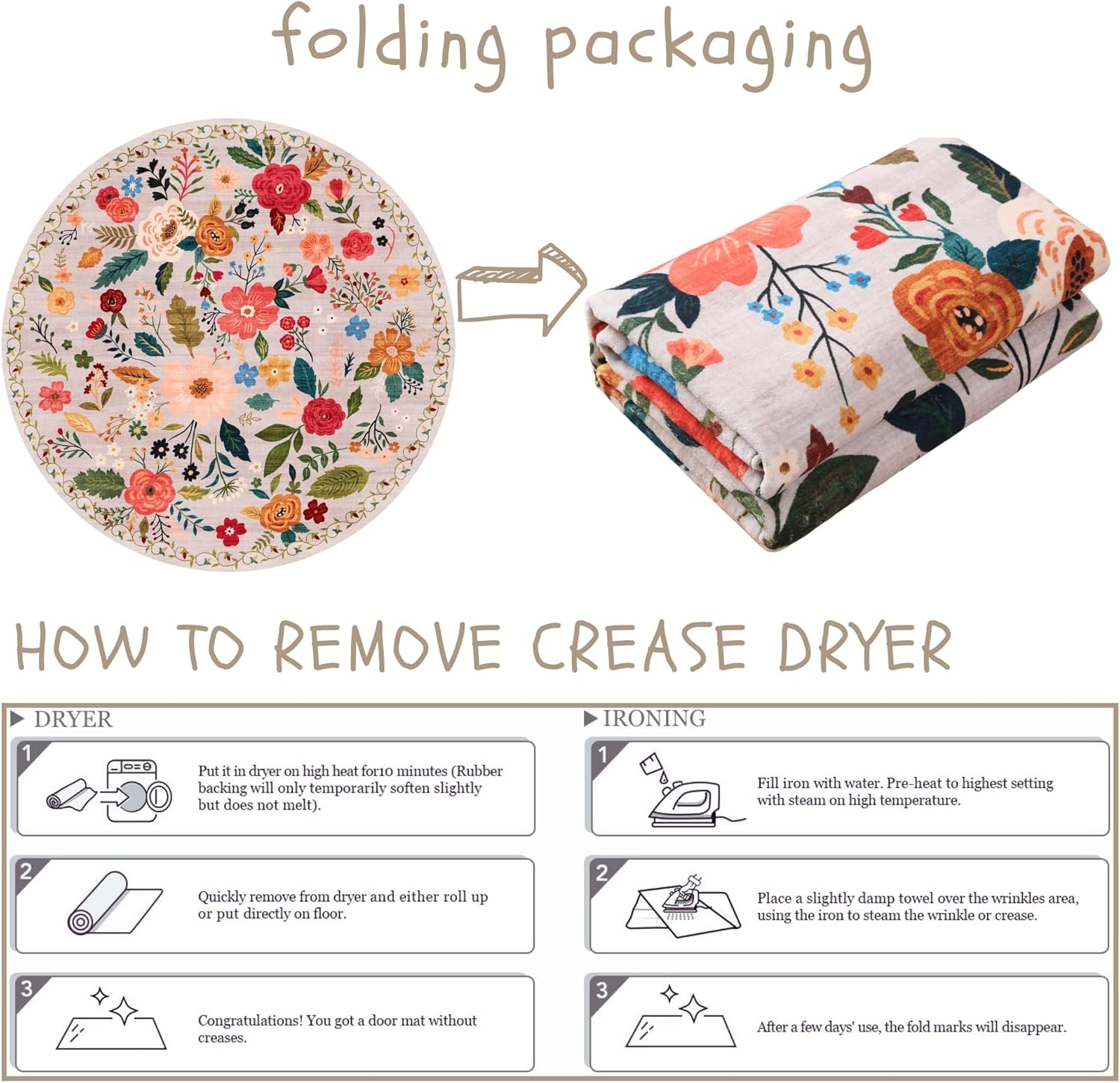 Rugcomf Round Rug 6ft Washable Circle Rug Non Slip Low Pile Boho Floral Small Circular Rug for Bedroom, Bathroom, Entryway, Kids Room, Office, College Dorm(Beige)