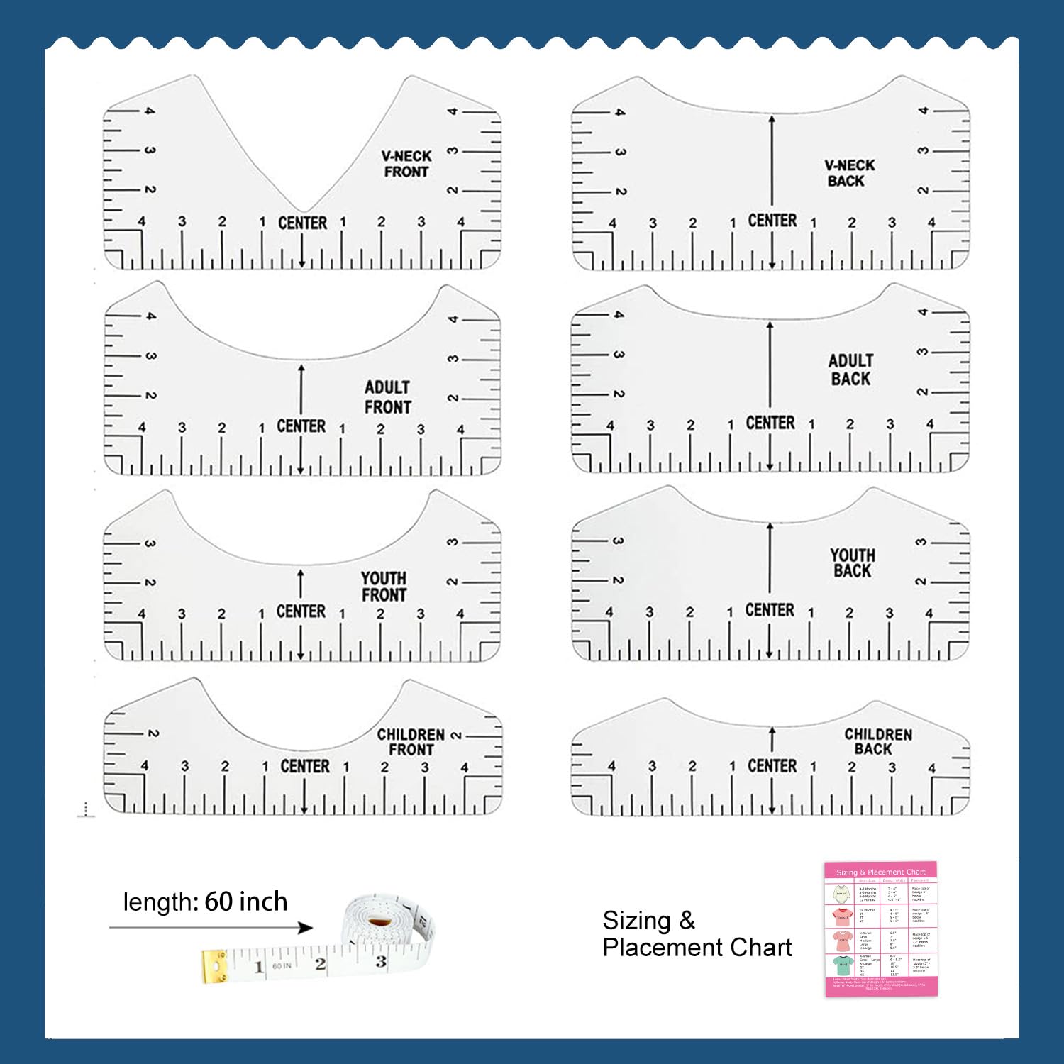 - What You Get: 8 t-shirt rulers, 1 measuring tape & 1 product instruction. 8 different sizes of craft ruler guide including v-neck youth child can meet different needs, bring you much handmade convenience
