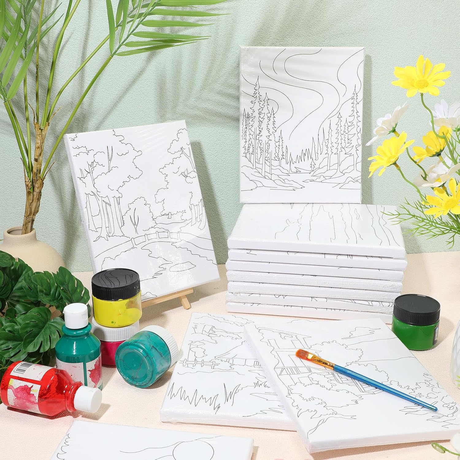 - Value Package: pre printed canvas for painting package includes 12 pre painted canvases, 12 paints in12 colors, 12 flat pen, 12 pointed pen, 12 palettes in 6 colors, 12 wooden easels; Whether you have an art party or just want to relax and paint, canvas with pictures to paint has got you covered; Note: the paint set is placed in the back of drawing board