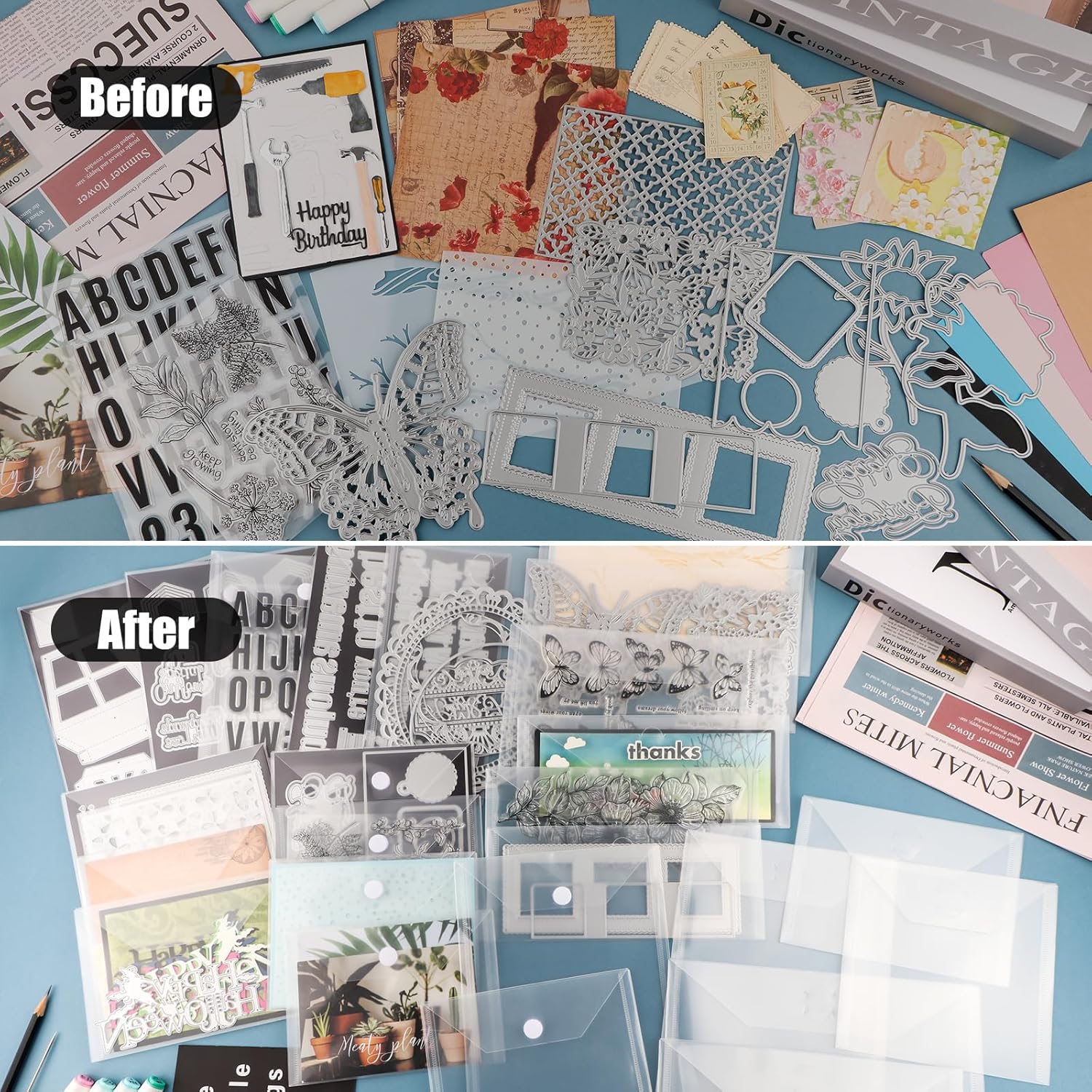 - π[CUTTING DIES STORAGE KITS]-- 150 PCS Stamp and die storage pockets 5 sizes 30 pcs each sizes ,sizes which is18x13cm/7x5inch;18x24cm/7x9.4inch;15x25.2cm/5.9x9.9inch;10x24cm/3.9x9.4inch;16.2x16.2cm/6.4x6.4inchenough quantity to meet your needs for daily cleaning,Conveniently organize and collect your handmade supplies