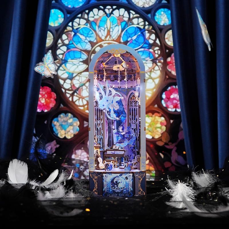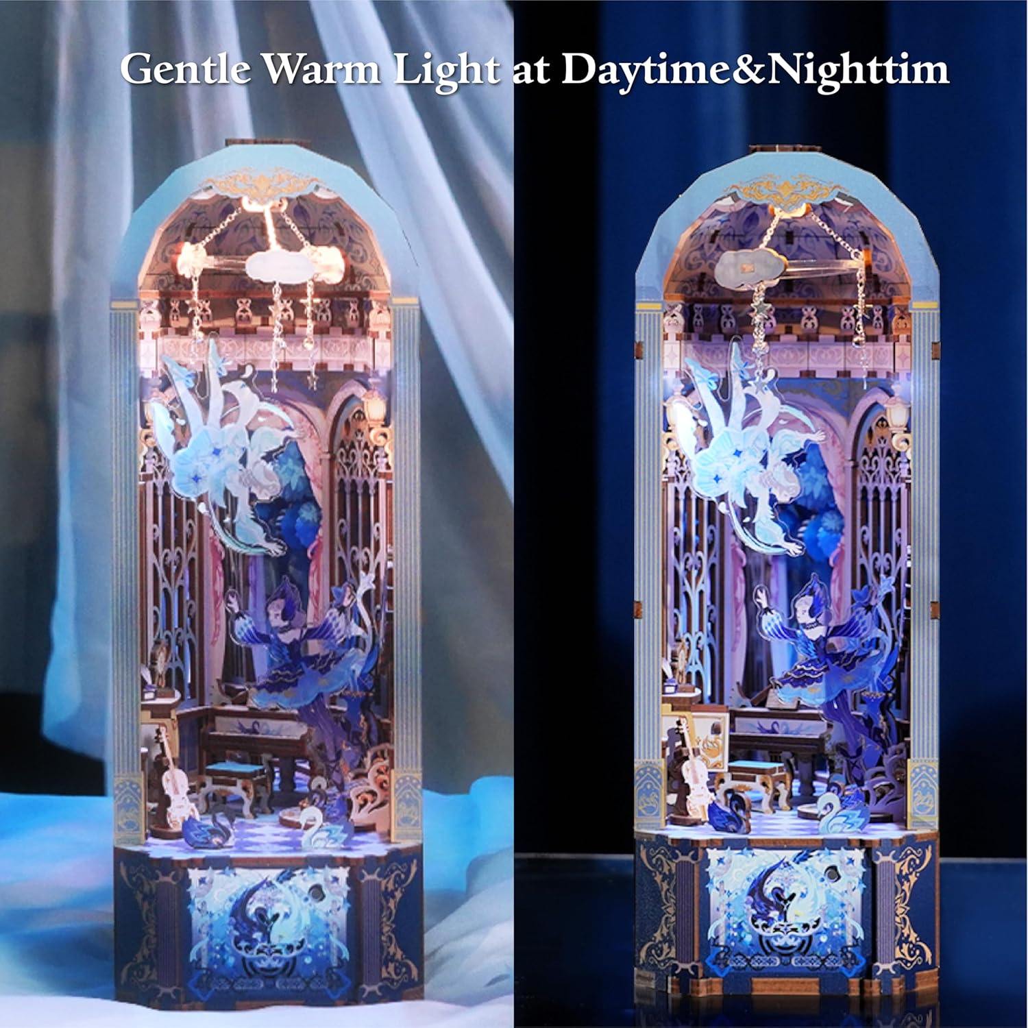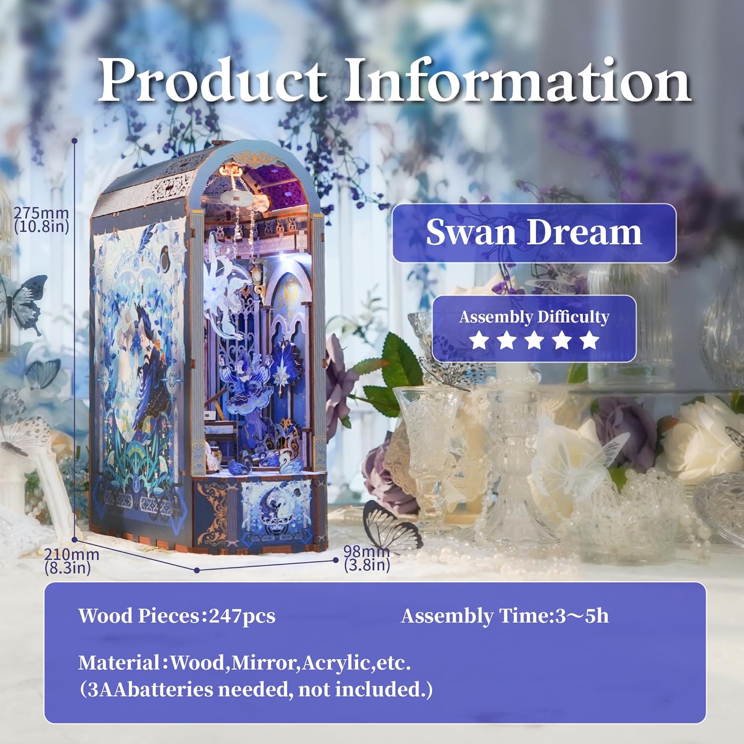 - Swan Dream DIY Book Nook Kit: The white swan and the black swan dance the swan dance accompanied by elegant music in the dreamy European castle. The starry chandelier lights up, the pure white swan dances gently and stretches, tough black swan elegantly pirouette, together forming a beautiful scene.