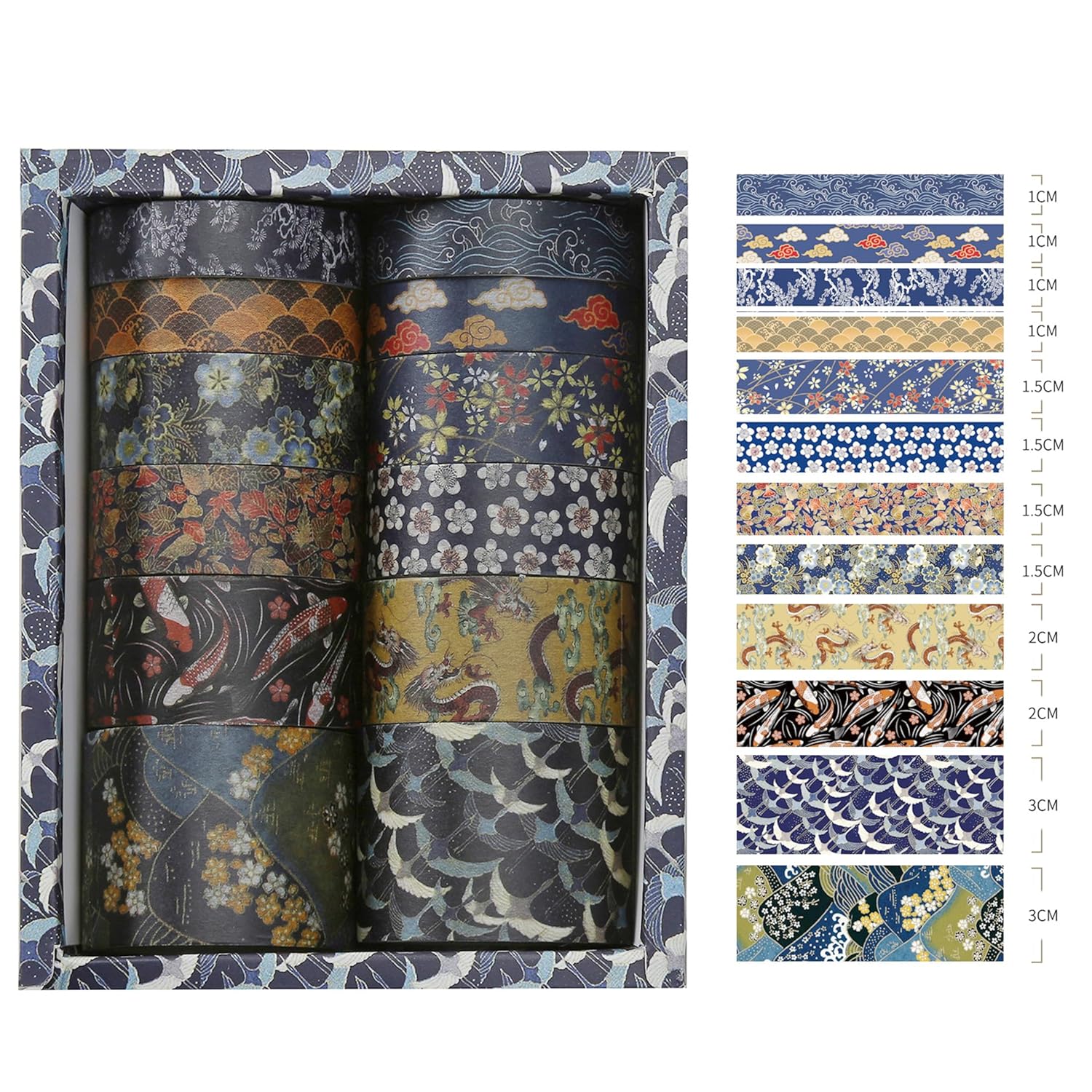 12 Rolls Kyoto Charm Washi Tape Set Japanese Arts Adhesive Tapes Geometric Garden Decorative Masking Tape Sets for Craft, Kids, Scrapbook, DIY, Gift Wrapping (Cerulean Showa)