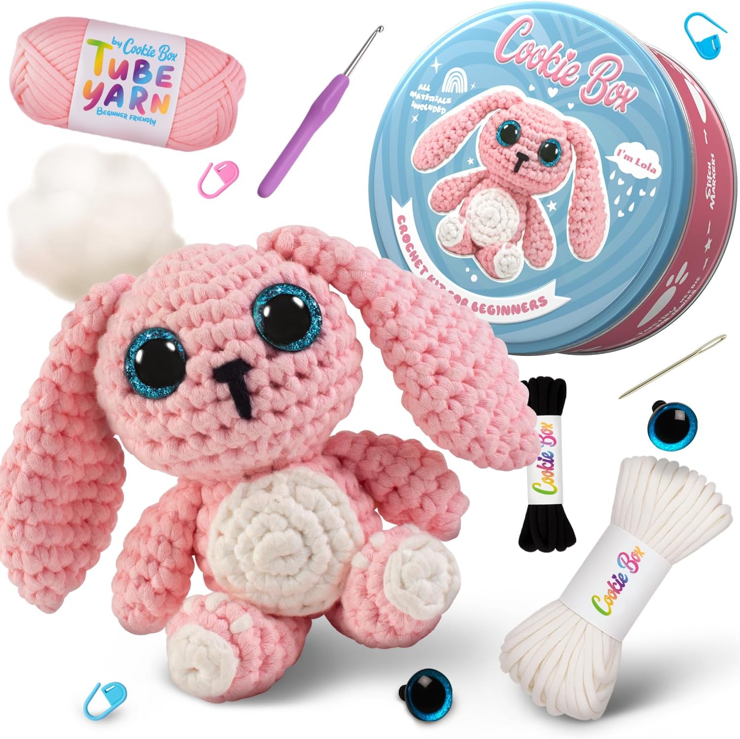 Cookie Box Crochet Kit for Beginners β Gift Set to Make Bunny Lola Amigurumi Plushie β Easy DIY Crochet & Knitting Starter Kit with Video and PDF Tutorials