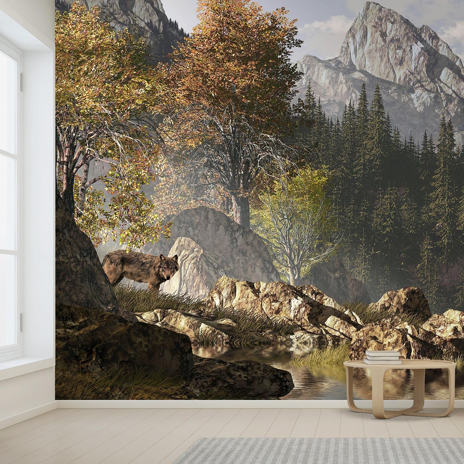 wall26 Wolf Near a Lake in a Rocky Mountain Landscape. Removable Wall Mural | Self-Adhesive Large Wallpaper - 96x144 inches