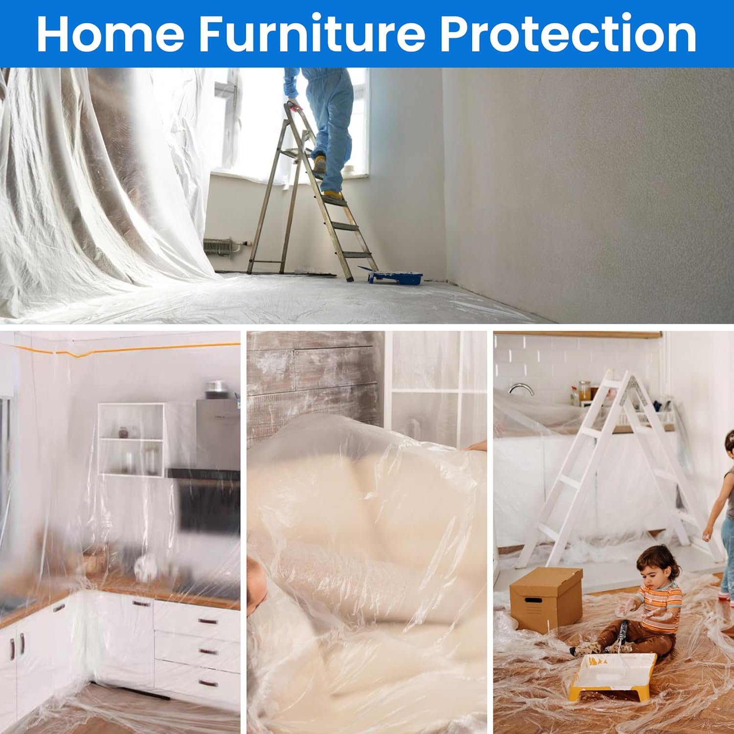 - PLASTIC FOR PAINTING PROTECTION: The Masking Film is the plastic drop cloth film, has highly resistant to tearing, ensuring complete surface protection by attracting dust and debris. It can prevent household appliances and furniture from dust and paint to protect your furniture. Can also be used as car dust cover ensuring complete surface protection.