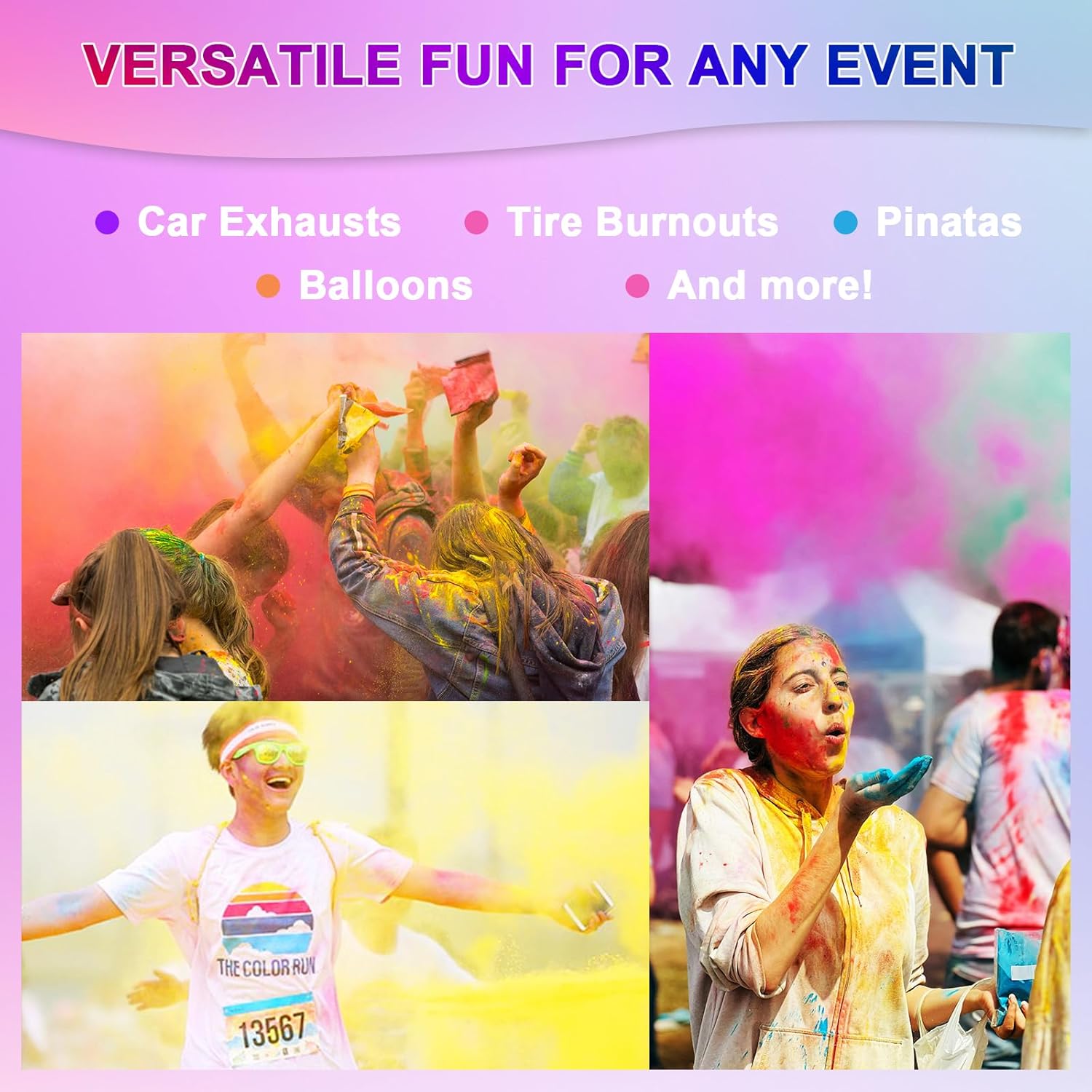 - 🎉Celebrate with Excitement: Add a unique touch to your events with our powdered chalk! From gender reveal smoke bombs to goblies throwable paintballs, our color war powder delivering an impressive burst, ideal for fun runs, color fights, color races, marathon, summer camps, photoshoots, fundraisers, Rangoli, Olympic Games and DIY tumbler. Quality & safe, ideal slime making, game powder, rangoli powder, concrete color powder,paint powder and color war accessories.