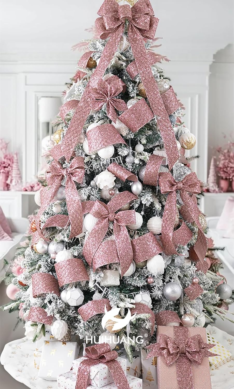 - Application: This ribbon can be used in a variety of Christmas decorations, including tree trimming, wreaths, garlands, gift wrapping, table centerpieces, swags, door hanger, lantern, tree topper bows, rose gold color theme Chrisrmas decor etc