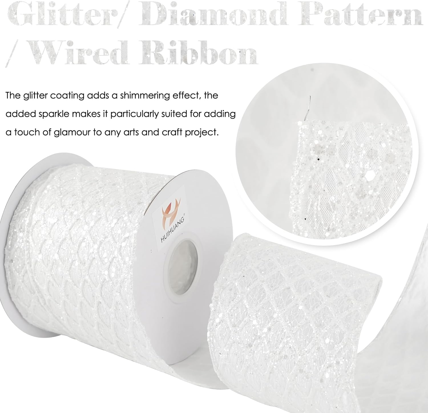 HUIHUANG White Glitter Wired Ribbon, 4 Inch x 30 Ft, Geometric Pattern, Polyester Material, Christmas Occasion
