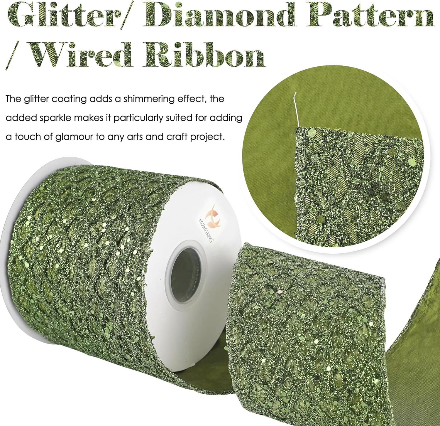 - Color: Moss green glitter wired ribbon brings a bright and beautiful sparkly touchness to your decoration craft ideas and holiday gift wrapping, especially for Christmas tree decorations and more