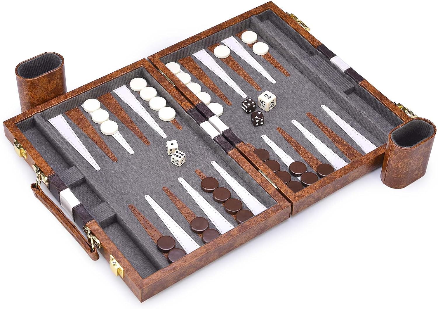 AMEROUS Backgammon Set, 11 Inches Classic Board Game withLeather Case, Folding Board, Gift Package, Portable Travel Strategy Backgammon Game Set for Adults, Kids (Small, Brown)