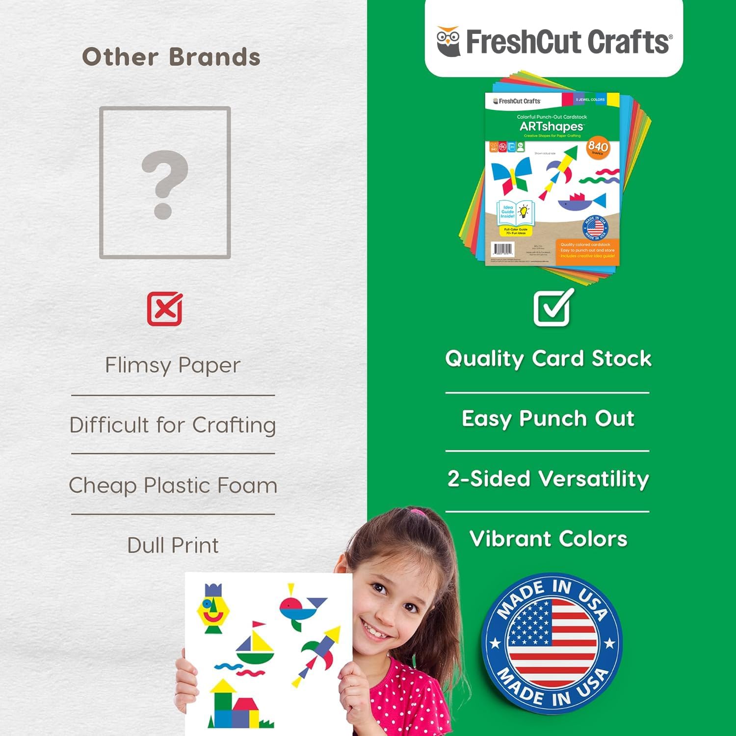 - HIGH-QUALITY CARD STOCK: Pack includes 20 sheets of sturdy, high-quality US Made cardstock that holds easy punch-out shapes in 5 bold colors. 840 pieces in total. Our products are NOT printed, NOT construction paper, NOT foam shapes!
