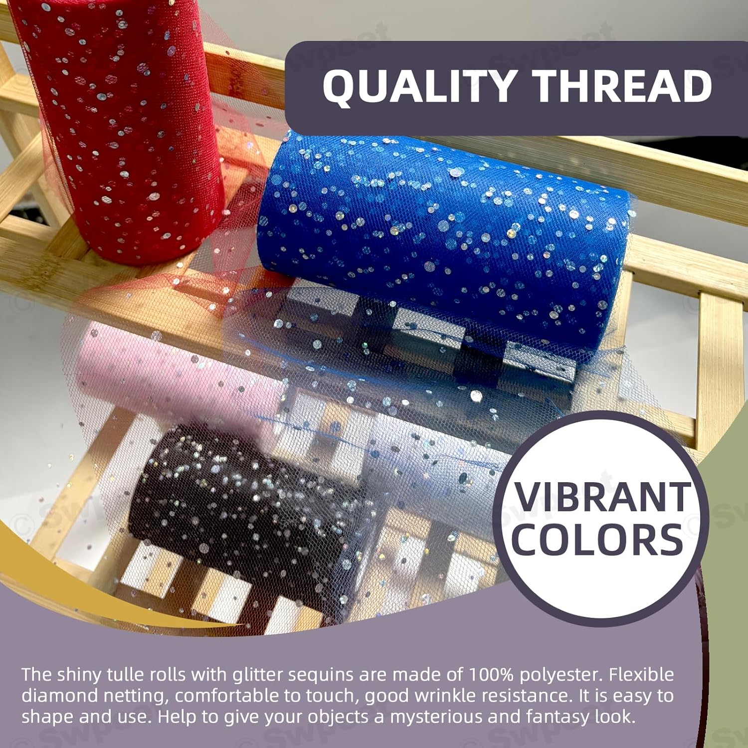 - 💥【Easy to Use】------ Each tulle fabric spool measures 6 inch x 50 yards, sufficient length, continuous and uninterrupted. The whole roll of tulle fabric has no splice marks and is easy to apply, just cut the length of sheer fabric you want to decorate. The shiny sparking and glitter sequin is more beautiful than another tulle. Flexible and easy to use.