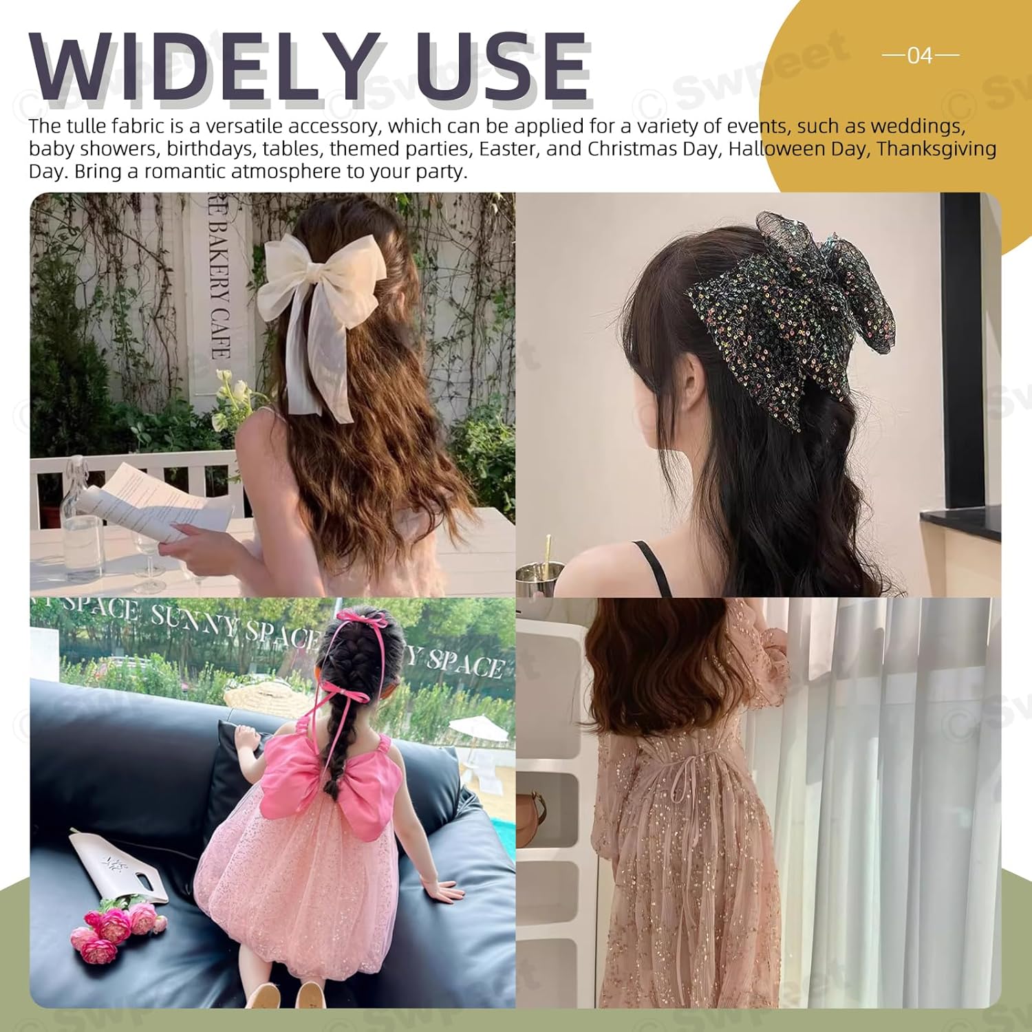 - 💥【Wide Applications】------ Tulle fabric has soft color and sheer fabric, it often appears as a decoration on various occasions: wedding, baby showers, party, Christmas, celebrations, graduations, banquet events. This fabric roll is also great for tutu skirts, chiffon ribbon, bouquets, gift bow craft, table decorations, wrapping favors and other floral craft projects.