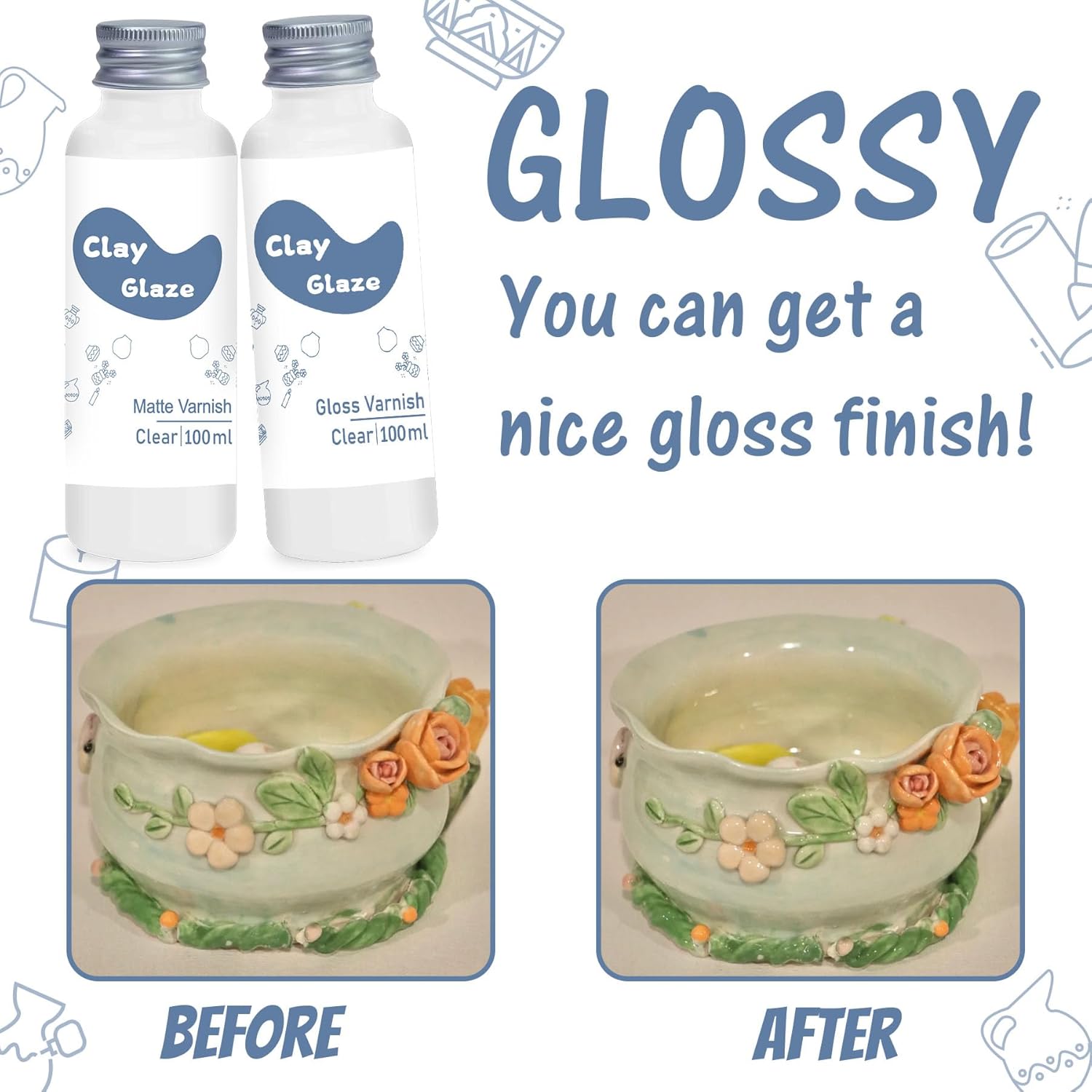 - Perfect Gift: Clay gloss varnish: high luster, more colorful and vivid. Clay matte varnish: Low shine, more naturally. This is definitely a great gift for anyone who loves air-dry clay. WAN2TLK clay glaze air dry it seals, protect and strengthen clay pieces