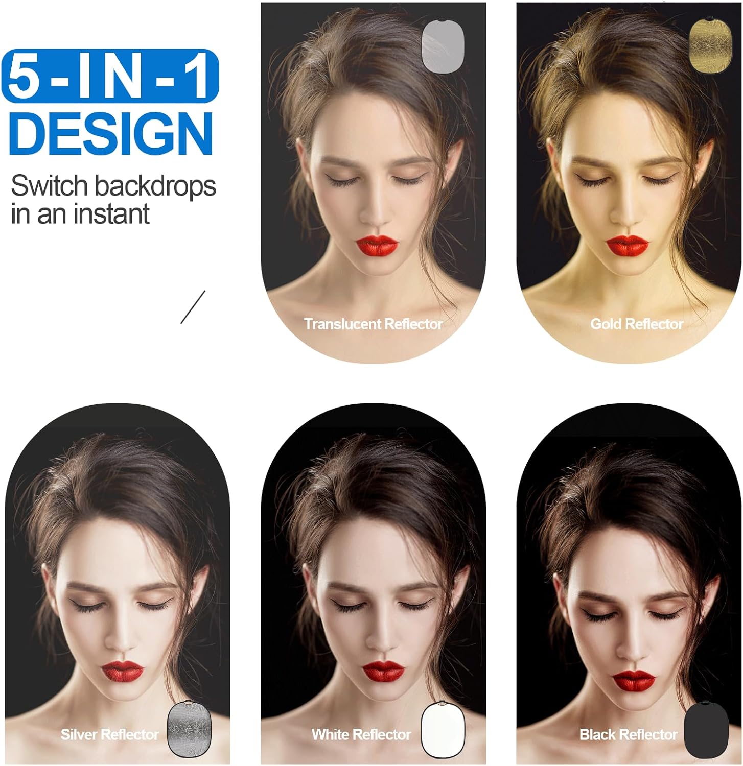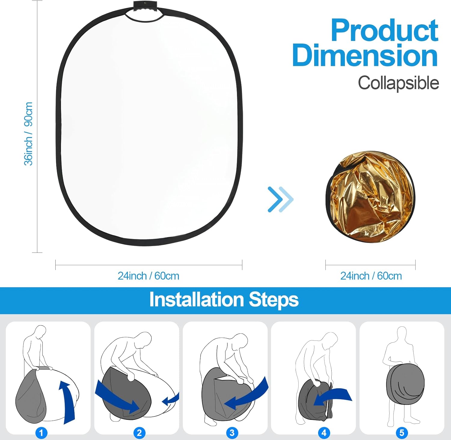 - 【5-In-1】This 24"x36" (60x90cm) 5-in-1 interchangeable reflector (silver/gold/white/black/translucent) lets you bounce light with ease: silver reflects light without distorting color; gold warms up the scene, ideal for outdoor shooting; white softens light and preserves natural color; black absorbs light to create dark effects; translucent diffuses light and eliminates shadows.