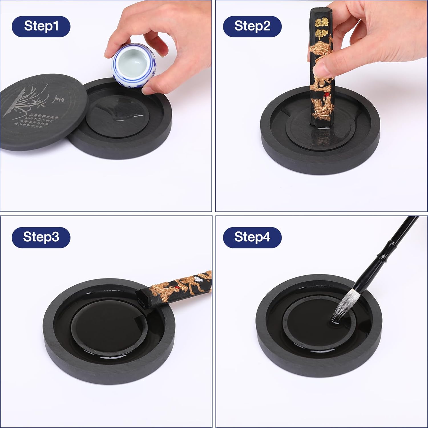 - Chinese Calligraphy Set: Including 4 chinese calligraphy sumi brushes, one calligraphy ink stone, one calligraphy ink stick, one chinese calligraphy seal, one porcelain bowl, one ceramic brush rest and one red inkpad, total 10 items