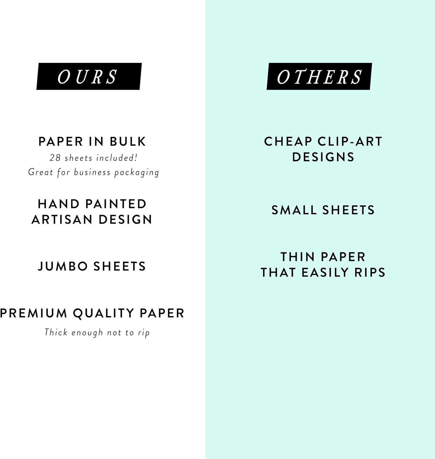- BULK LOT: Includes: 28 large oversized sheets (20 x 26 inches) PREMIUM MATERIAL: Lightweight yet thick & durable patterned tissue paper MULTIPURPOSE: Perfect for gift wrapping, crafting, and stuffing paper packaging for business