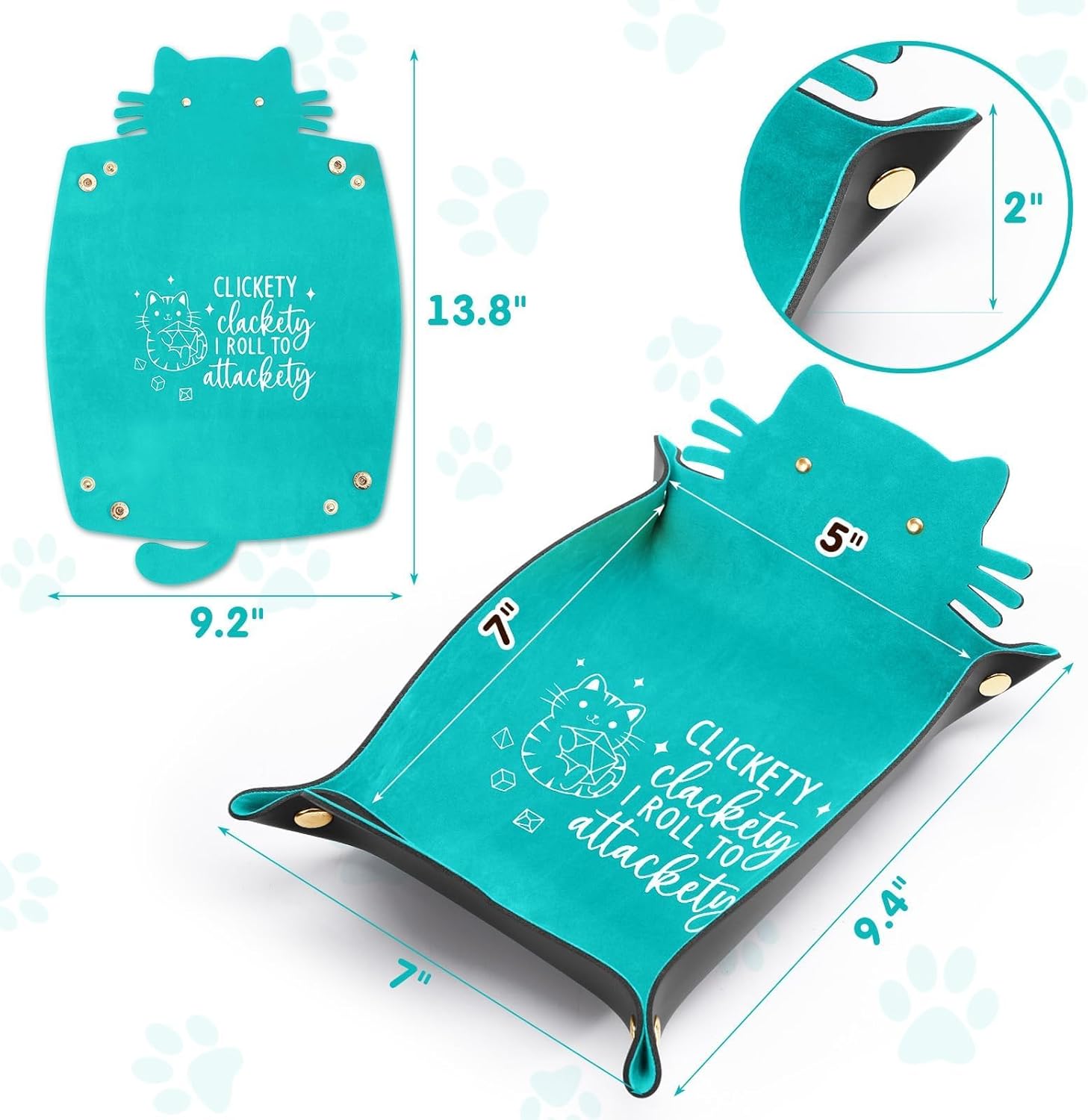 - DND Dice Tray: Package includes 2-pack cat-shaped leather trays which are printed with cute cat and funny words featuring purple and blue colors. Nice gift idea for the role-playing games players