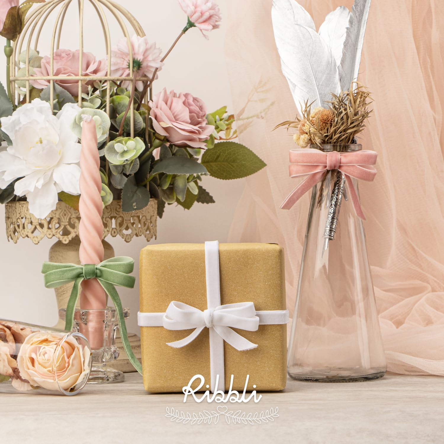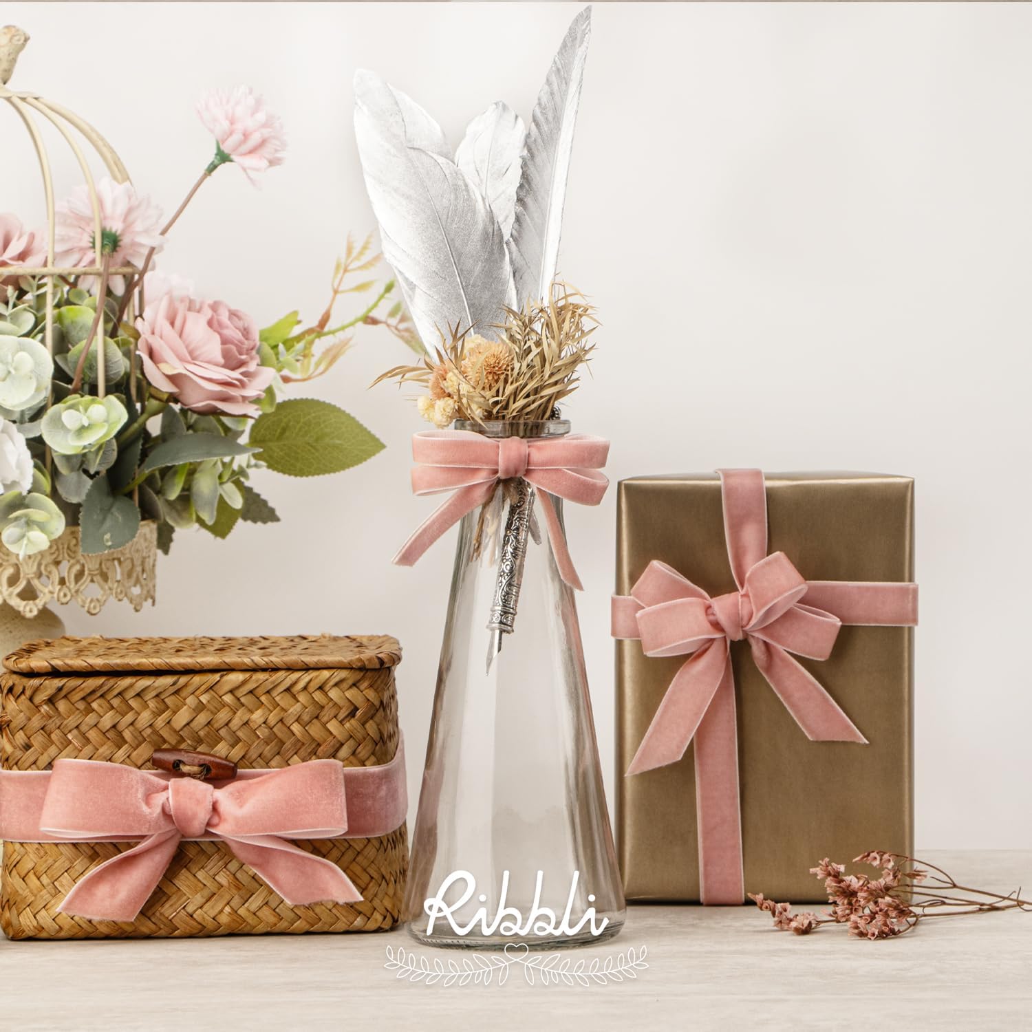 Ribbli Rose Gold Velvet Ribbon 3/8 Inches Continuous10 Yard Spool Dusty Pink Christmas Ribbon for Gift Wrapping Crafts Home Decor