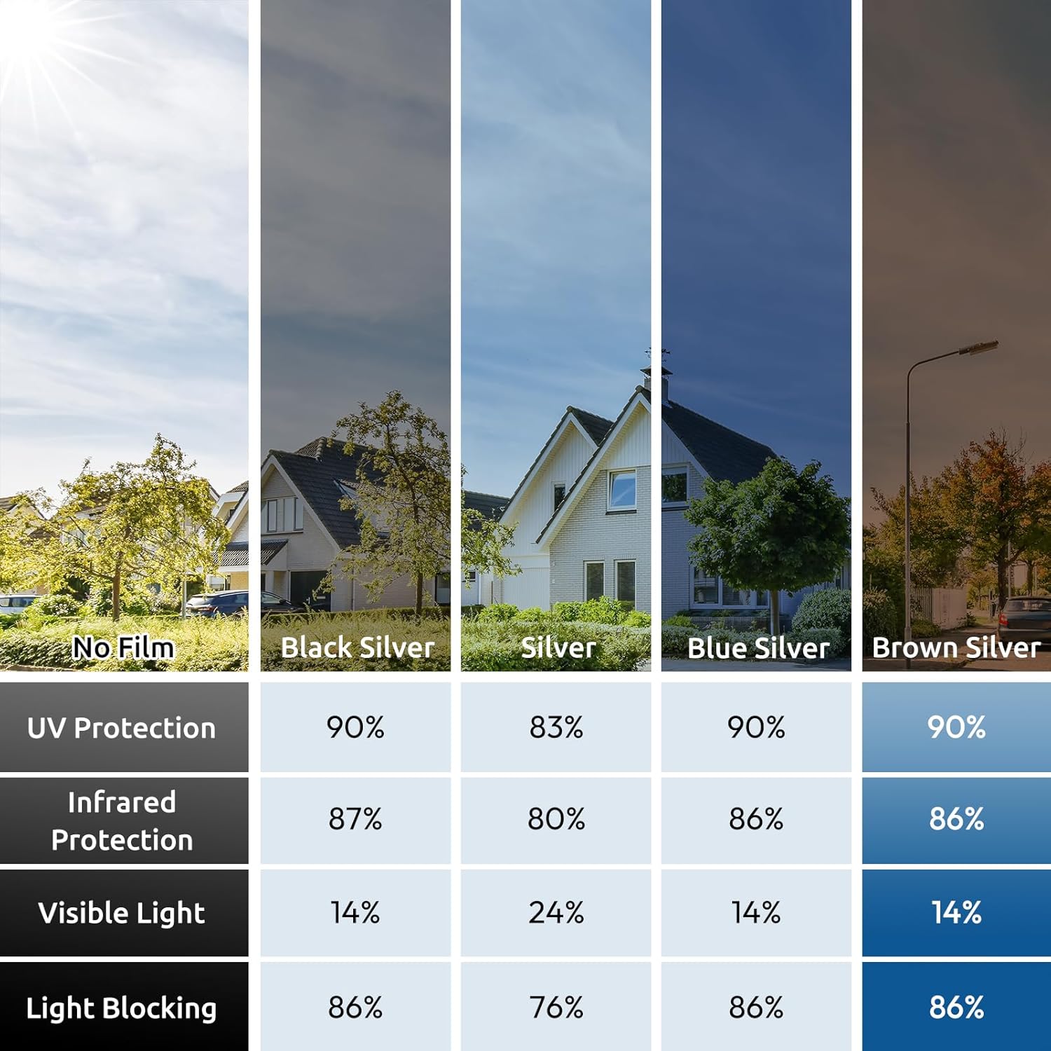 - UV Protection, Glare Reduction: Blocks up to 90% of UV rays, this window film heat blocking helps protect flooring, furniture, and draperies from fading. It also protects your eyes and skin from harmful UV rays. With 14% VLT, it effectively reduces glare while allowing some visible light in, creating a comfortable indoor environment